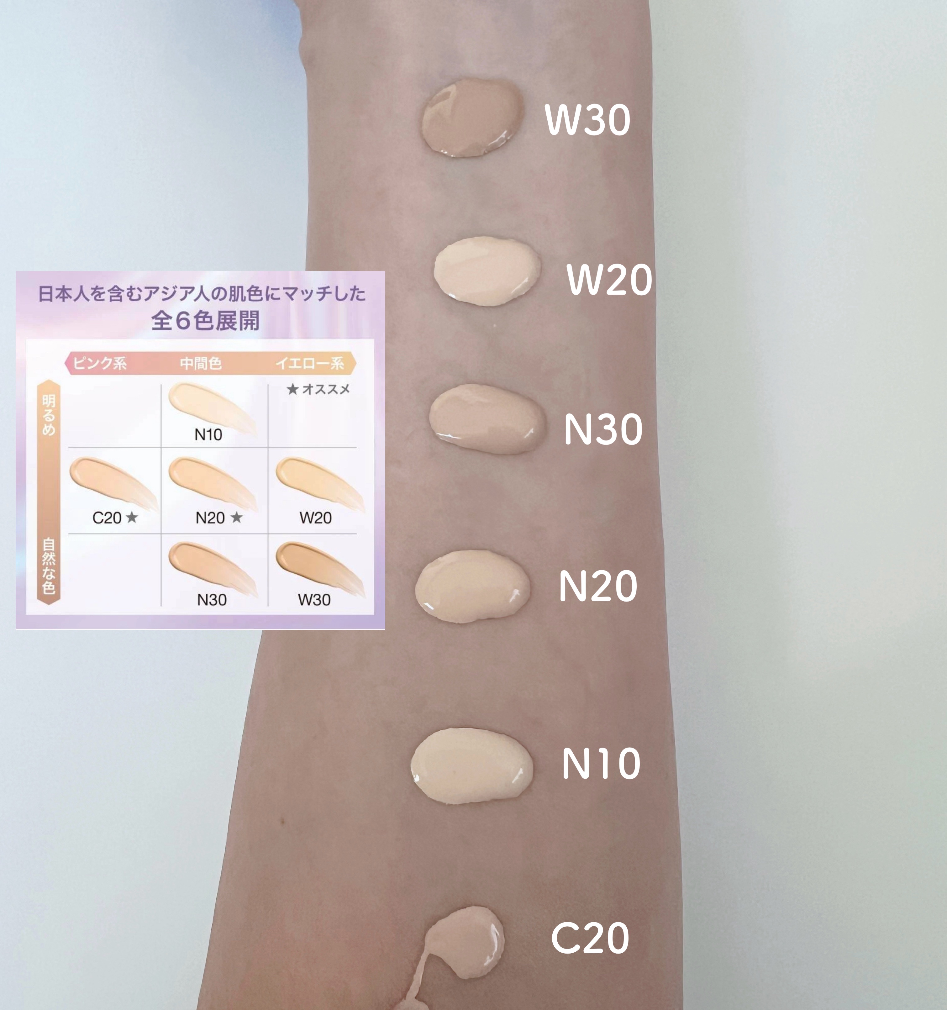 - <C20> 水、ジメチコン、イソドデカン、エタノール、トリメチルシロキシケイ酸、BG、PEG-10ジメチコン、パーライト、ナイロン-12、ラウロイルサルコシンイソプロピル、セバシン酸ジイソプロピル、(HDI/トリメチロールヘキシルラクトン)クロスポリマー、ビス(PEG/PPG-14/14)ジメチコン、ジステアルジモニウムヘクトライト、硫酸Mg、フェノキシエタノール、ステアロイルグルタミン酸2Na、シリル化シリカ、テトラ(ヒドロキシステアリン酸/イソステアリン酸)ジペンタエリスリチル、加水分解ダイズタンパク、プロリン、PEG/PPG/ポリブチレングリコール-8/5/3グリセリン、トコフェロール、ナイアシンアミド、香料、グリセリン、シリカ、グルタミン酸、リモネン、ペンチレングリコール、(アクリル酸グリセリル/アクリル酸)コポリマー、リナロール、[+/-]、酸化チタン、酸化鉄、合成フルオロフロゴパイト、水酸化Al、マイカ、酸化スズ <N10> 水、ジメチコン、イソドデカン、エタノール、トリメチルシロキシケイ酸、BG、PEG-10ジメチコン、パーライト、ナイロン-12、ラウロイルサルコシンイソプロピル、セバシン酸ジイソプロピル (HDI/トリメチロールヘキシルラクトン)クロスポリマー、ビス(PEG/PPG-14/14)ジメチコン、ジステアルジモニウムヘクトライト、硫酸Mg、フェノキシエタノール、ステアロイルグルタミン酸2Na、シリル化シリカ、テトラ(ヒドロキシステアリン酸/イソステアリン酸)ジペンタエリスリチル、加水分解ダイズタンパク、プロリン、PEG/PPG/ポリブチレングリコール-8/5/3グリセリン、トコフェロール、ナイアシンアミド、香料、グリセリン、シリカ、グルタミン酸、リモネン、ペンチレングリコール (アクリル酸グリセリル/アクリル酸)コポリマー、リナロール、[+/-]、酸化チタン、酸化鉄、合成フルオロフロゴパイト、水酸化Al、マイカ、酸化スズ <N20> 水、ジメチコン、イソドデカン、エタノール、トリメチルシロキシケイ酸、BG、PEG-10ジメチコン パーライト、ナイロン-12、ラウロイルサルコシンイソプロピル、セバシン酸ジイソプロピル (HDI/トリメチロールヘキシルラクトン)クロスポリマー、ビス(PEG/PPG-14/14)ジメチコン、ジステアルジモニウムヘクトライト、硫酸Mg、フェノキシエタノール、ステアロイルグルタミン酸2Na、シリル化シリカ、テトラ(ヒドロキシステアリン酸/イソステアリン酸)ジペンタエリスリチル 加水分解ダイズタンパク、プロリン、PEG/PPG/ポリブチレングリコール-8/5/3グリセリン トコフェロール、ナイアシンアミド、香料、グリセリン、シリカ、グルタミン酸、リモネン、ペンチレングリコール(アクリル酸グリセリル/アクリル酸)コポリマー、リナロール、[+/-]、酸化チタン、酸化鉄、合成フルオロフロゴパイト、水酸化Al、マイカ、酸化スズ <N30> 水、ジメチコン、イソドデカン、エタノール、トリメチルシロキシケイ酸、BG、PEG-10ジメチコン、パーライト、ナイロン-12、ラウロイルサルコシンイソプロピル、セバシン酸ジイソプロピル (HDI/トリメチロールヘキシルラクトン)クロスポリマー、ビス(PEG/PPG-14/14)ジメチコン、ジステアルジモニウムヘクトライト、硫酸Mg、フェノキシエタノール、ステアロイルグルタミン酸2Na、シリル化シリカ、テトラ(ヒドロキシステアリン酸/イソステアリン酸)ジペンタエリスリチル 加水分解ダイズタンパク、プロリン、PEG/PPG/ポリブチレングリコール-8/5/3グリセリン トコフェロール、ナイアシンアミド、香料、グリセリン、シリカ、グルタミン酸、リモネン、ペンチレングリコール(アクリル酸グリセリル/アクリル酸)コポリマー、リナロール、[+/-]、酸化チタン、酸化鉄、合成フルオロフロゴパイト、水酸化Al、マイカ、酸化スズ <W20> 水、ジメチコン、イソドデカン、エタノール、トリメチルシロキシケイ酸、BG、PEG-10ジメチコン パーライト、ナイロン-12、ラウロイルサルコシンイソプロピル、セバシン酸ジイソプロピル (HDI/トリメチロールヘキシルラクトン)クロスポリマー、ビス(PEG/PPG-14/14)ジメチコン、ジステアルジモニウムヘクトライト、硫酸Mg、フェノキシエタノール、ステアロイルグルタミン酸2Na、シリル化シリカ、テトラ(ヒドロキシステアリン酸/イソステアリン酸)ジペンタエリスリチル 加水分解ダイズタンパク、プロリン、PEG/PPG/ポリブチレングリコール-8/5/3グリセリン トコフェロール、ナイアシンアミド、香料、グリセリン、シリカ、グルタミン酸、リモネン、ペンチレングリコール(アクリル酸グリセリル/アクリル酸)コポリマー、リナロール、[+/-]、酸化チタン、酸化鉄、合成フルオロフロゴパイト、水酸化Al、マイカ、酸化スズ <W30> 水、ジメチコン、イソドデカン、エタノール、トリメチルシロキシケイ酸、BG、PEG-10ジメチコン、パーライト、ナイロン-12、ラウロイルサルコシンイソプロピル、セバシン酸ジイソプロピル (HDI/トリメチロールヘキシルラクトン)クロスポリマー、ビス(PEG/PPG-14/14)ジメチコン、ジステアルジモニウムヘクトライト、硫酸Mg、フェノキシエタ