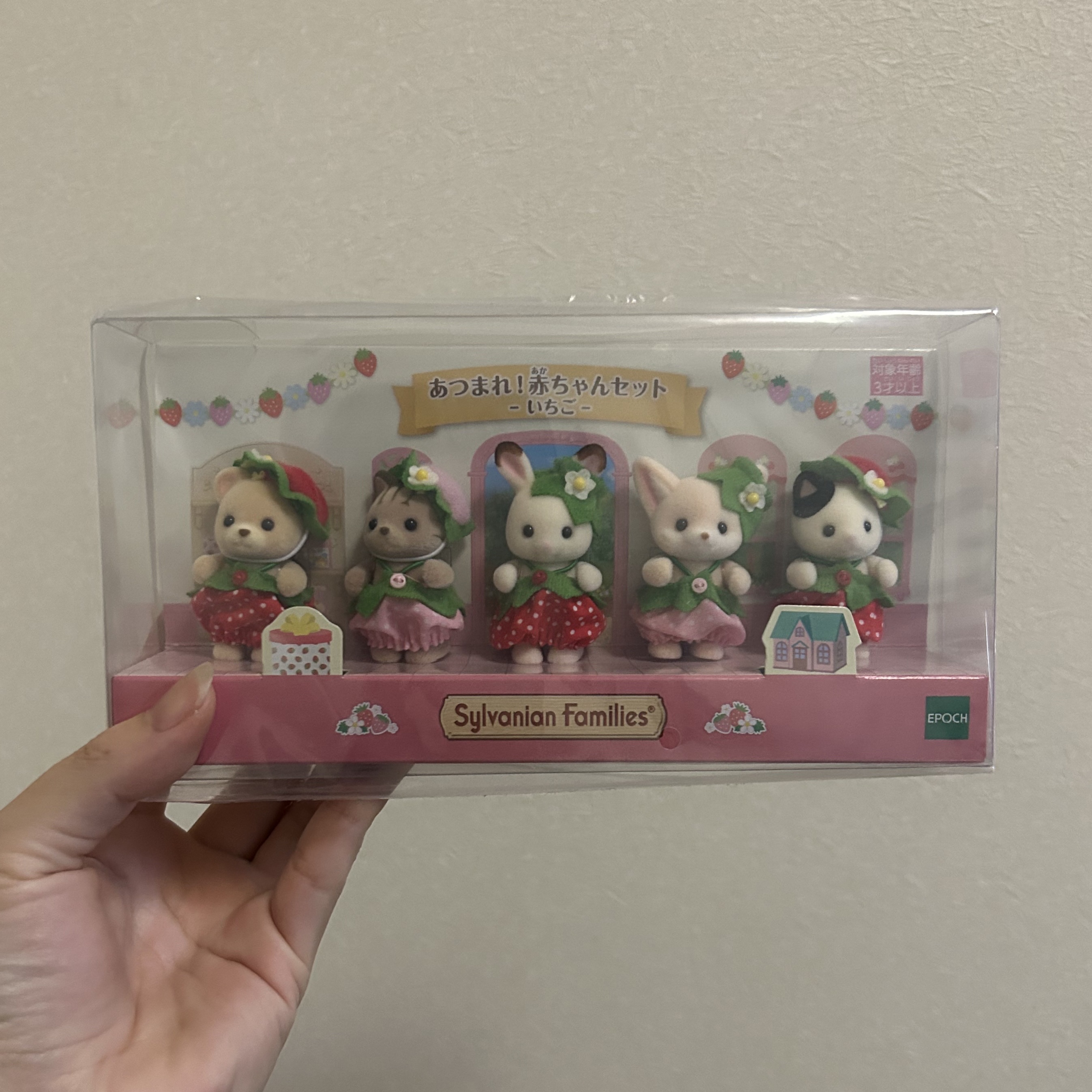 はい、いらっしゃいましたー!いちごのナーサリールームのみなさんです!!ナーサリールームの中のソフィーちゃんとリンネアちゃんがどこに入ってるんかわからんくてしばらく探しました。ギフトセットて外からも見える位置に飾りつけられてるやつ(透明のフィルムんとこで手振ってるやつ)しか買ったことないから、すげーこじんまりとしたところにコンパクトに収まってて見つけらんなかったゆ………かくれんぼが上手だねあ……………。