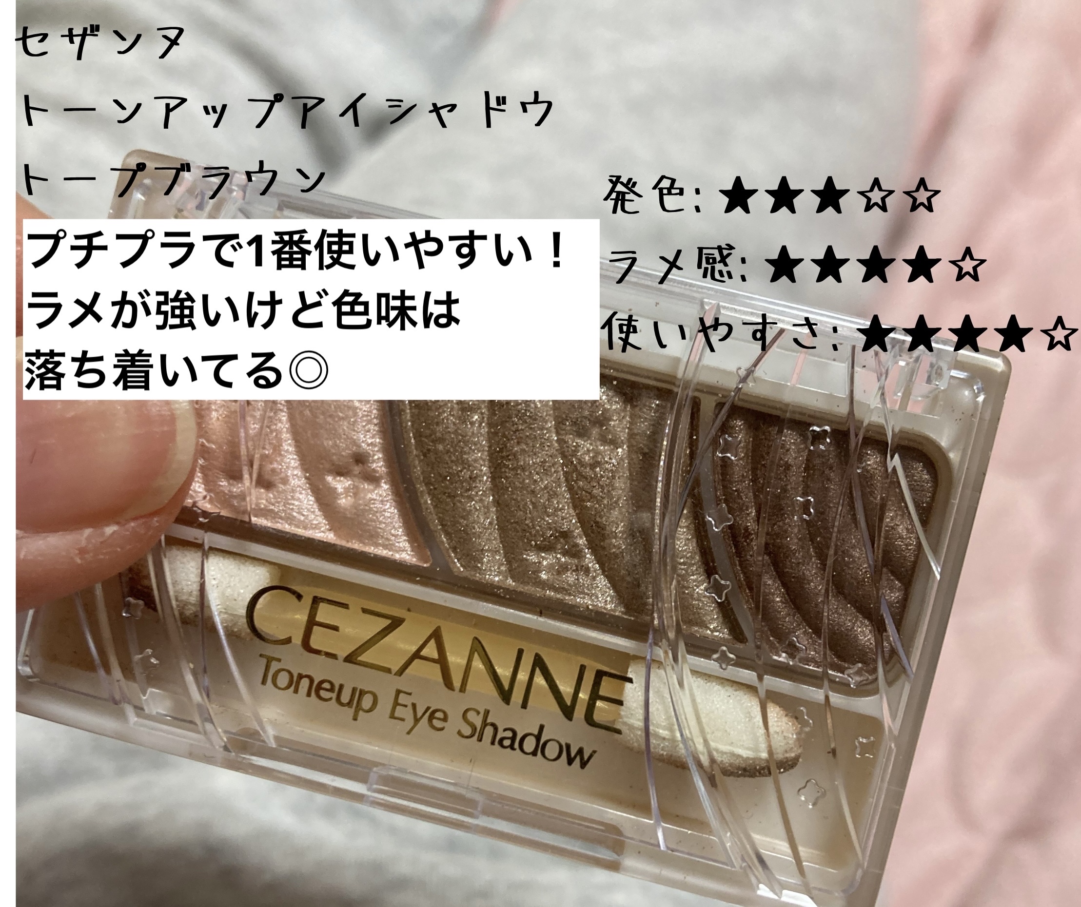 サラッとしてるけどピタッと密着。ラメ落ちは感じませんでした。 淡いです!濃いめが好きな人には物足りないかも💦逆にセザンヌのベージュトーンアイシャドウやビーアイドルのヌードベージュが好きな人はドンピシャだと思います! 派手すぎない色味 今のところなし