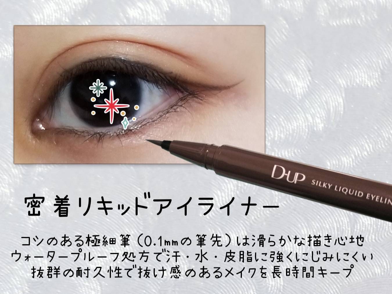 D-UPシルキーリキッドアイライナーチャコールモカLIPS(@lipsjp)さまからいただきました。4月10日より発売予定の新色を早速試してみました♪シルキーリキッドアイライナーの魅力は、なんと言ってもその描きやすさ。0.1mmの極細...