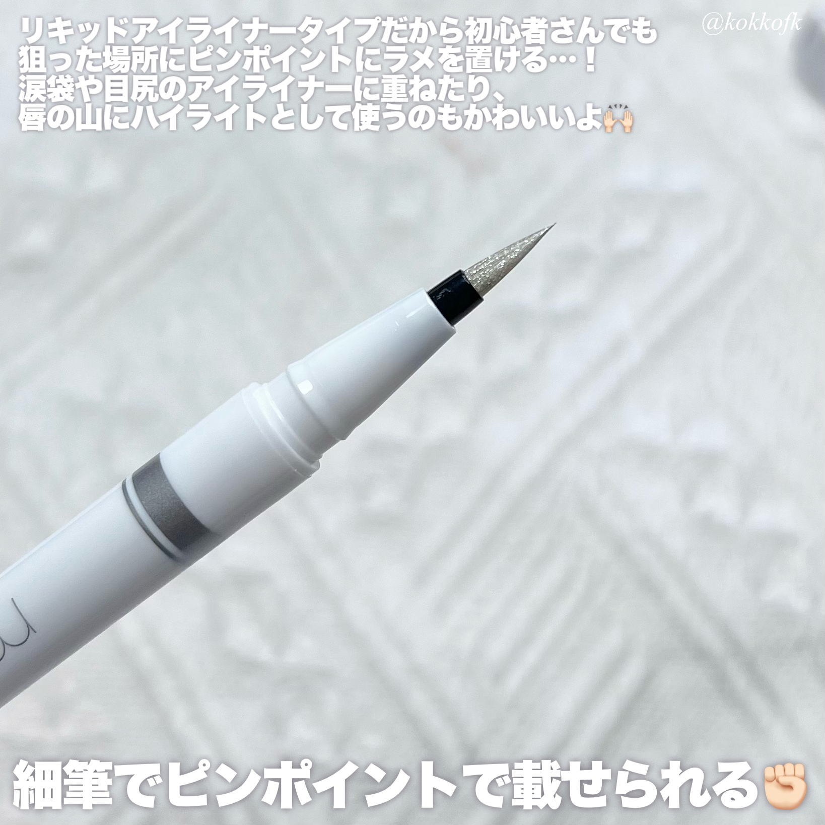 リキッドアイライナーの中に大粒のグリッターパールを配合し、長時間キラめきを密着してくれます! 筆先が0.1mmの極細筆で細部までしっかりラメを乗せることができます👏🏻 私が買ったシェリーピンクは青みの強くないピンクベージュなのでイエベでもブルベでも使いやすいと思います!