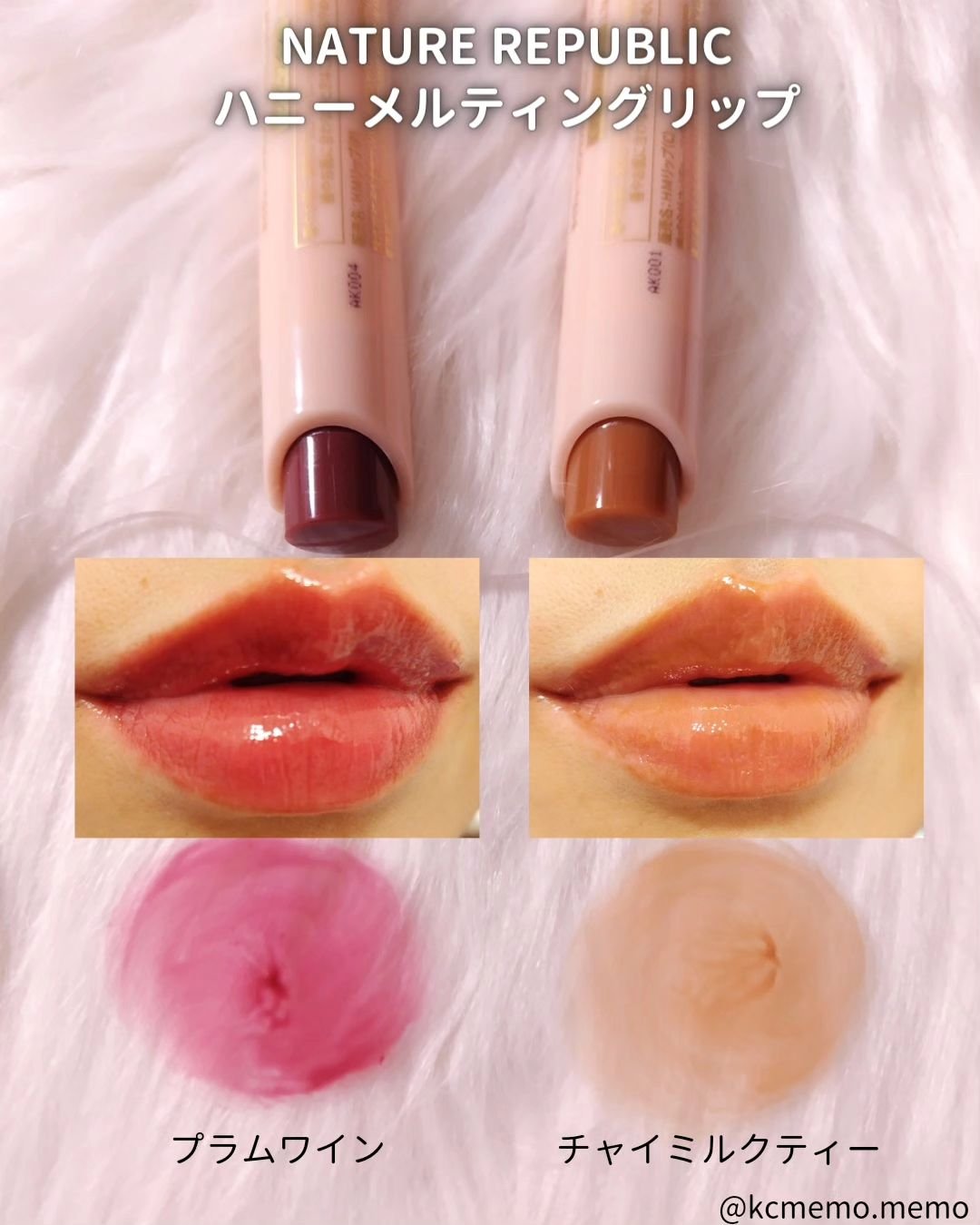 ネイチャーリパブリック ハニーメルティングリップ 01 アプリコットティー 02 イチジクミルク 03 ベリーヨーグルト 04 ザクロサワー 05 プラムワイン 06 チャイミルクティー #韓国コスメ #韓国リップ #ツヤリップ #冬顔メイクテクニック
