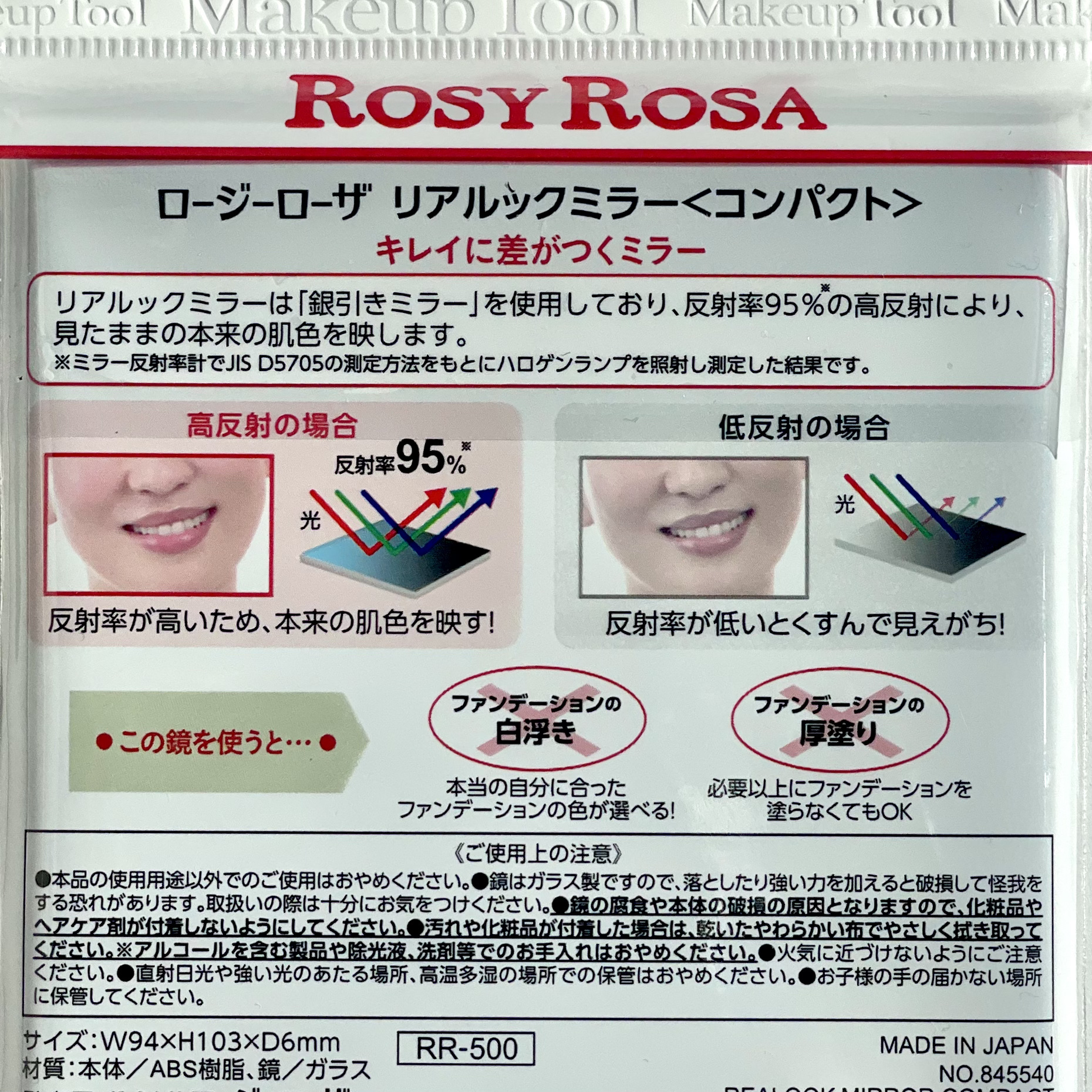 - リアルックミラーは【銀引きミラー】を使用しており、反射率95%(ミラー反射率計でJIS D5705の測定方法をもとにハロゲンランプを照射し測定した結果)の高反射により、見たままの本来の肌色を映します。 <ミニ> 手軽に使えるミニサイズなので、小さなバッグやポーチに入れて持ち運び可能です。