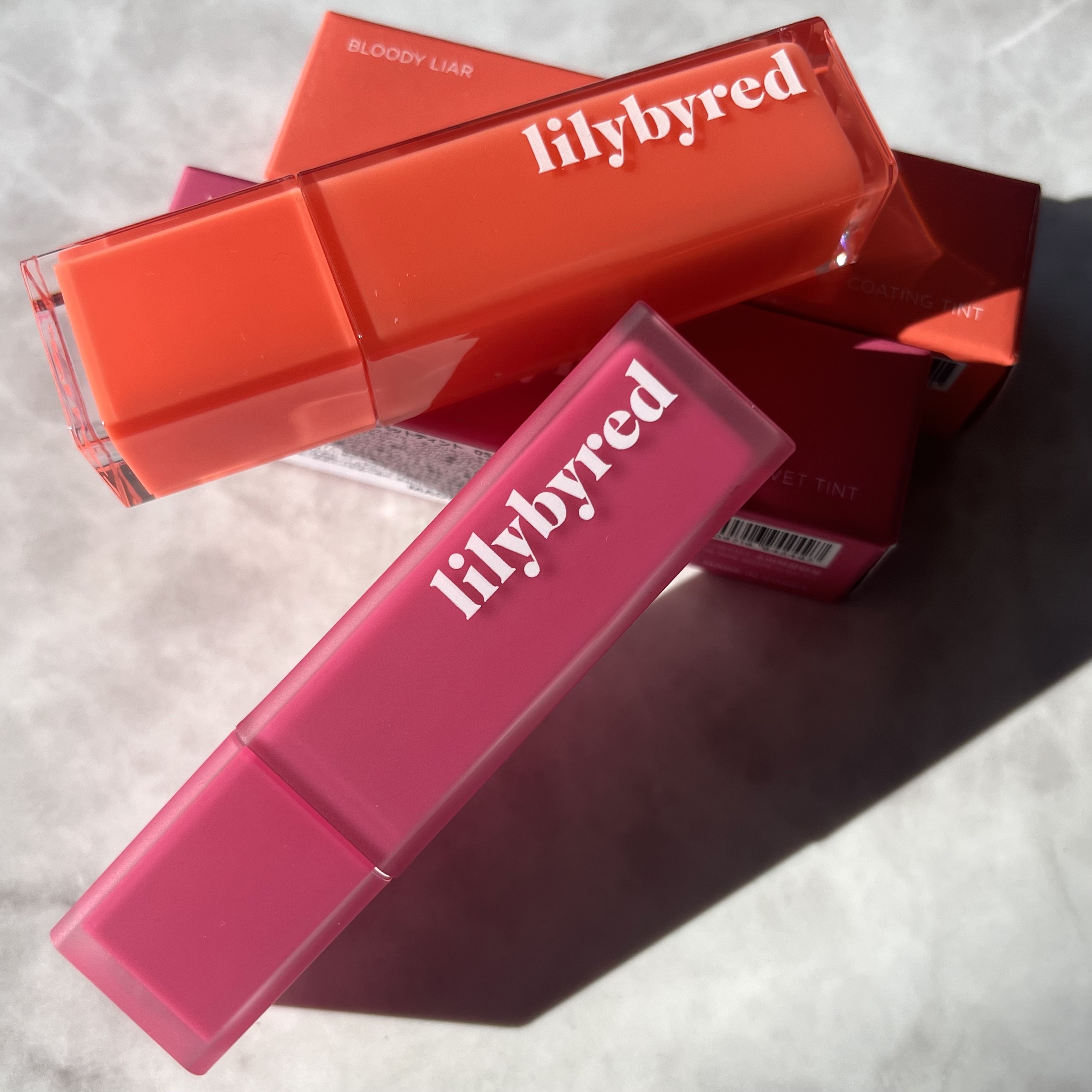 🌻1本500円で買えたlilybyred🌻・ブラッディライアーコーティングティント03クレバーマンガップル・ムードライアーベルベットティント08メロウソフトパーシモン・ジューシーライアーウォーターティント01グアバモヒート質感の違う3種類を選...