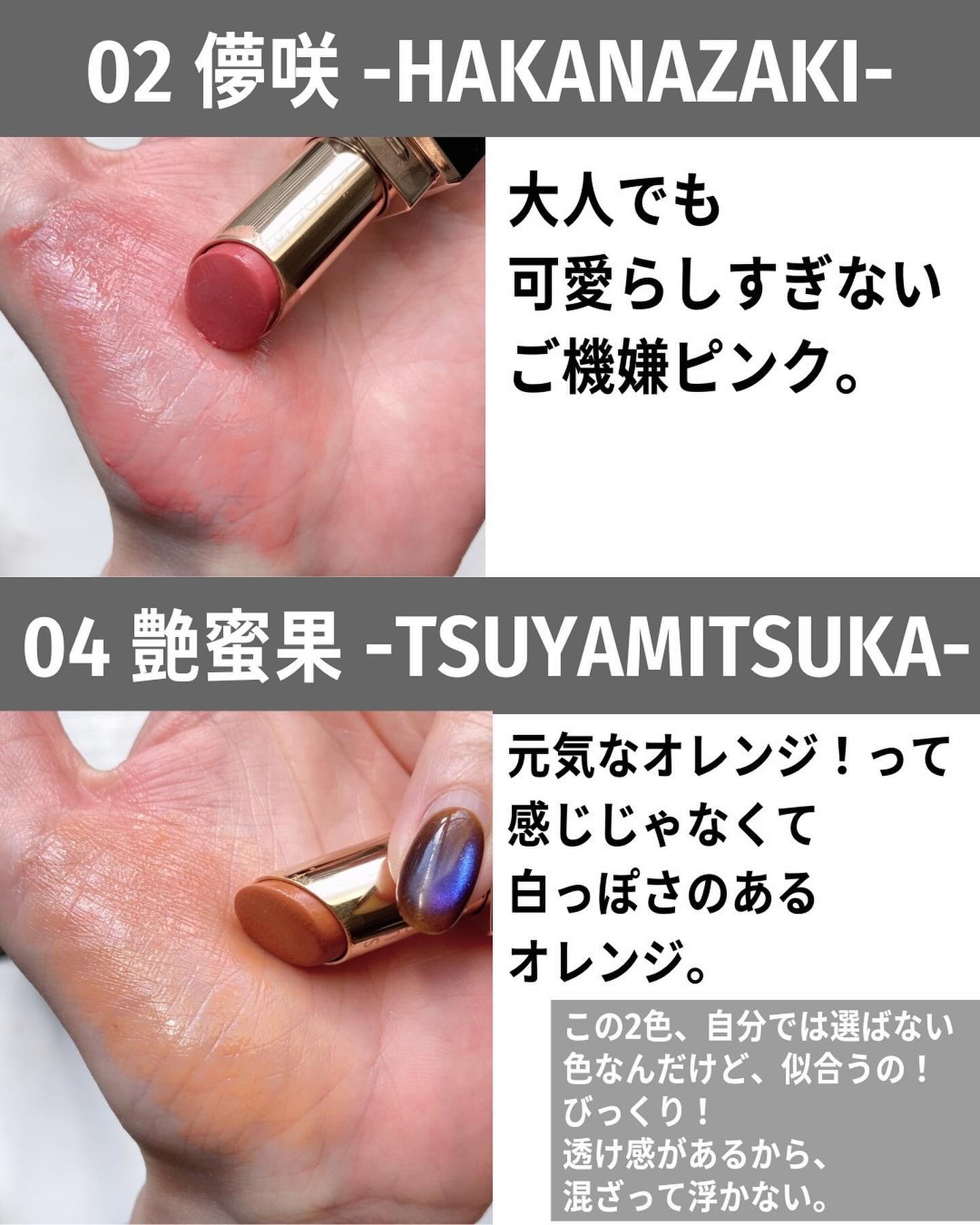 - <01 陽風 - HINATAKAZE> 水添ポリイソブテン、デカイソステアリン酸ポリグリセリル-10、トリ(カプリル酸/カプリン酸)グリセリル、ラウロイルグルタミン酸ジ(オクチルドデシル/フィトステリル/ベヘニル)、ダイマージリノール酸(フィトステリル/イソステアリル/セチル/ステアリル/ベヘニル)、オクチルドデカノール、ラウロイルグルタミン酸ジ(フィトステリル/オクチルドデシル)、パラフィン、トリポリヒドロキシステアリン酸ジペンタエリスリチル、ポリエチレン、マイクロクリスタリンワックス、(イソステアリン酸ポリグリセリル-2/ダイマージリノール酸)コポリマー、水添マイクロクリスタリンワックス、スクワラン、ヒドロキシステアリン酸エチルヘキシル、リンゴ酸ジイソステアリル、トコフェロール、アンズ核油、カニナバラ果実油、ブドウ種子油、(エチレン/プロピレン)コポリマー、ジメチコン、ヒアルロン酸Na、(+/-)(チタン/酸化チタン)焼結物、セルロース、ラウロイルアスパラギン酸Na、ラウロイルリシン、塩化亜鉛、酸化チタン、酸化鉄、水酸化Al、硫酸Ba、トリイソステアリン酸イソプロピルチタン、トリエトキシカプリリルシラン、合成フルオロフロゴパイト、黄4、青1、赤104(1)、赤201、赤202 <02 儚咲 - HAKANAZAKI> 水添ポリイソブテン、デカイソステアリン酸ポリグリセリル-10、トリ(カプリル酸/カプリン酸)グリセリル、ラウロイルグルタミン酸ジ(オクチルドデシル/フィトステリル/ベヘニル)、ダイマージリノール酸(フィトステリル/イソステアリル/セチル/ステアリル/ベヘニル)、オクチルドデカノール、ラウロイルグルタミン酸ジ(フィトステリル/オクチルドデシル)、パラフィン、トリポリヒドロキシステアリン酸ジペンタエリスリチル、ポリエチレン、マイクロクリスタリンワックス、(イソステアリン酸ポリグリセリル-2/ダイマージリノール酸)コポリマー、水添マイクロクリスタリンワックス、スクワラン、ヒドロキシステアリン酸エチルヘキシル、リンゴ酸ジイソステアリル、トコフェロール、アンズ核油、カニナバラ果実油、ブドウ種子油、(エチレン/プロピレン)コポリマー、ジメチコン、ヒアルロン酸Na、(+/-)(チタン/酸化チタン)焼結物、セルロース、ラウロイルアスパラギン酸Na、ラウロイルリシン、塩化亜鉛、酸化チタン、酸化鉄、水酸化Al、硫酸Ba、トリイソステアリン酸イソプロピルチタン、トリエトキシカプリリルシラン、合成フルオロフロゴパイト、黄4、青1、赤104(1)、赤201、赤202 <03 恋紬 - KOITSUMUGI> 水添ポリイソブテン、デカイソステアリン酸ポリグリセリル-10、トリ(カプリル酸/カプリン酸)グリセリル、ラウロイルグルタミン酸ジ(オクチルドデシル/フィトステリル/ベヘニル)、ダイマージリノール酸(フィトステリル/イソステアリル/セチル/ステアリル/ベヘニル)、オクチルドデカノール、ラウロイルグルタミン酸ジ(フィトステリル/オクチルドデシル)、パラフィン、トリポリヒドロキシステアリン酸ジペンタエリスリチル、ポリエチレン、マイクロクリスタリンワックス、(イソステアリン酸ポリグリセリル-2/ダイマージリノール酸)コポリマー、水添マイクロクリスタリンワックス、スクワラン、ヒドロキシステアリン酸エチルヘキシル、トコフェロール、アンズ核油、カニナバラ果実油、ブドウ種子油、(エチレン/プロピレン)コポリマー、ジメチコン、ヒアルロン酸Na、(+/-)(チタン/酸化チタン)焼結物、セルロース、ラウロイルアスパラギン酸Na、ラウロイルリシン、塩化亜鉛、酸化チタン、酸化鉄、水酸化Al、硫酸Ba、トリイソステアリン酸イソプロピルチタン、合成フルオロフロゴパイト、黄4、赤201、赤202 <04 艶蜜果 - TSUYAMITSUKA> 水添ポリイソブテン、デカイソステアリン酸ポリグリセリル-10、トリ(カプリル酸/カプリン酸)グリセリル、ラウロイルグルタミン酸ジ(オクチルドデシル/フィトステリル/ベヘニル)、ダイマージリノール酸(フィトステリル/イソステアリル/セチル/ステアリル/ベヘニル)、オクチルドデカノール、ラウロイルグルタミン酸ジ(フィトステリル/オクチルドデシル)、パラフィン、トリポリヒドロキシステアリン酸ジペンタエリスリチル、ポリエチレン、マイクロクリスタリンワックス、(イソステアリン酸ポリグリセリル-2/ダイマージリノール酸)コポリマー、水添マイクロクリスタリンワックス、スクワラン、ヒドロキシステアリン酸エチルヘキシル、トコフェロール、アンズ核油、カニナバラ果実油、ブドウ種子油、(エチレン/プロピレン)コポリマー、ジメチコン、ヒアルロン酸Na、(+/-)(チタン/酸化チタン)焼結物、セルロース、ラウロイルアスパラギン酸Na、ラウロイルリシン、塩化亜鉛、酸化チタン、酸化鉄、水酸化Al、硫酸Ba、トリイソステアリン酸イソプロピルチタン、合成フルオロフロゴパイト、黄4、赤201、赤202 <05 耀紫 - YOUYUKARI> 水添ポリイソブテン、デカイソステアリン酸ポリグリセリル-10、トリ(カプリル酸/カプリン酸)グリセリル、ラウロイルグルタミン酸ジ(オクチ