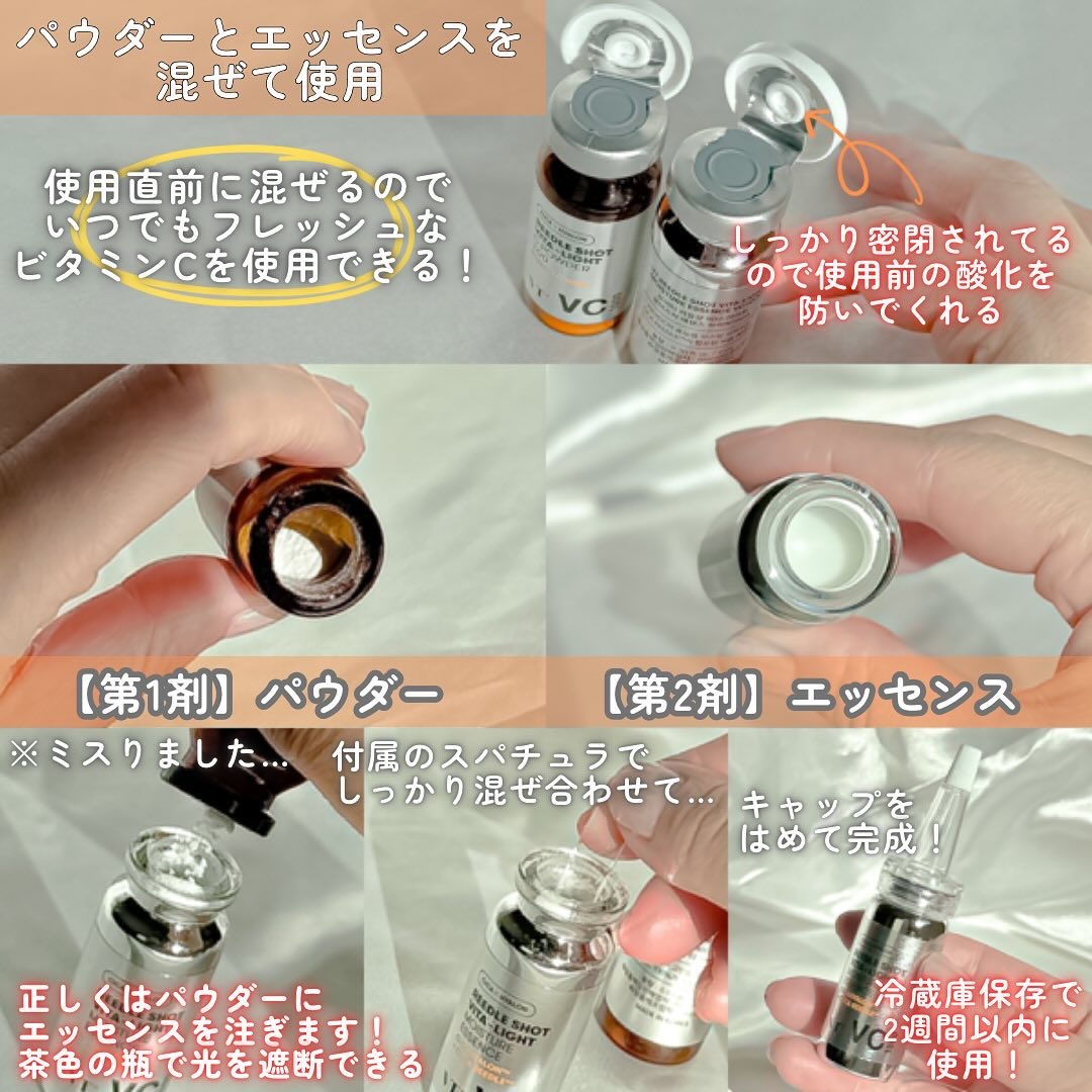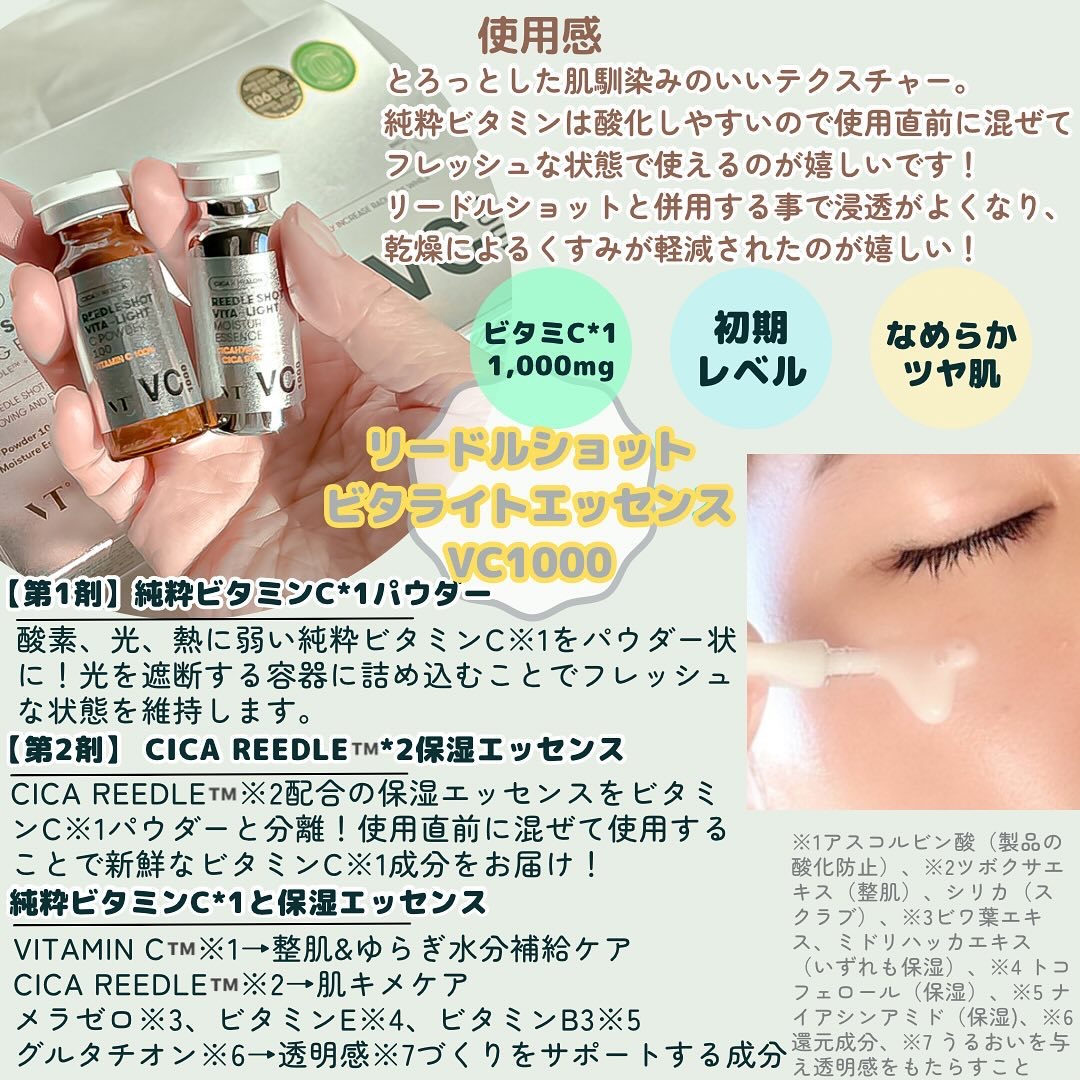 VTリードルショット100リードルショットビタライトCエッセンスパウダーと液体を混ぜて作る2液型のフレッシュなビタミンC美容液🍋1週間くらいで使い切れる小さいサイズで新鮮なまま使い切れるし、2液型だから混ぜるのも実験みたいで楽しい定番人気のリ...