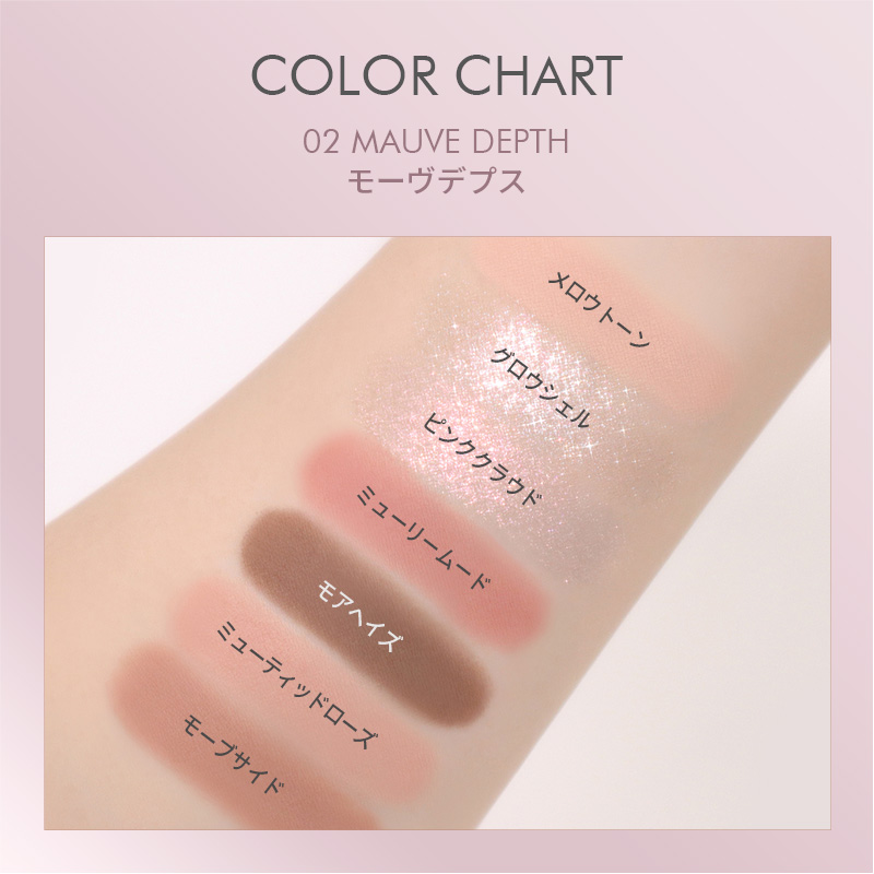 - 5段階の陰影とテクスチャーで叶える整形級別人アイメイク! きめ細かいパウダーで溶け込むようにブレンディング、重ね塗りしてもヨレることなく透明感を引き出すクリアな陰影メイク 使用頻度と活用度を考え、たくさん使うカラーはたっぷり大容量で構成し、全カラー同時に使い切れる底見えアイシャドウパレット 01 ベージュシンボル:抜け感のある穏やかな色のベージュブラウンカラー 02 モーヴデプス:繊細な淡い色のモーヴローズカラー 03 コーラルアフェア 04 ライラックレター