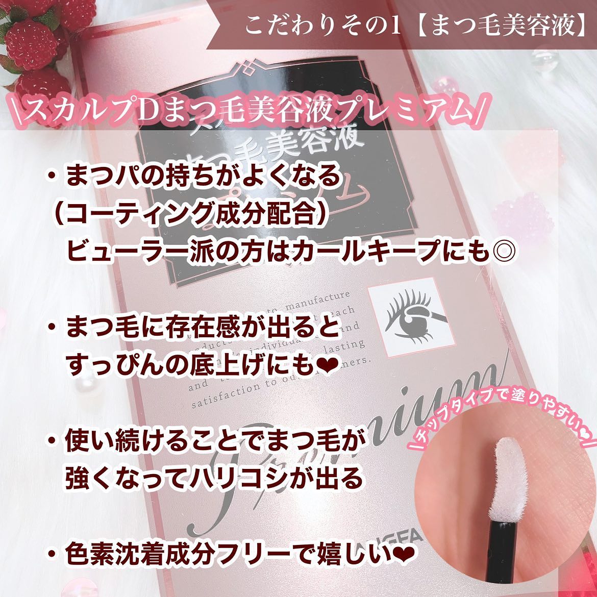 - スカルプDのまつ毛美容液プレミアムは、まつ毛ケア成分を通常品の2倍配合しており、1日1回のケアでもOK♪ さらに、プレミアムには、目元ケア成分配合。まつ毛のハリコシがアップし、上向きカールまつ毛をぐ~んとキープ♪ 使いやすさ・やさしさにこだわった、ふわふわカールチップ採用で根元からも塗りやすく、敏感な目元にやさしい使い心地です。 シリコン、オイル、アルコール(エタノール)、防腐剤(パラベン)、香料、合成着色料、界面活性剤、プロスタグランジン類似物質の8つの成分不使用の“ピュアフリー設計”を実現。 まつ毛エクステ、まつ毛パーマにもご使用いただけます。