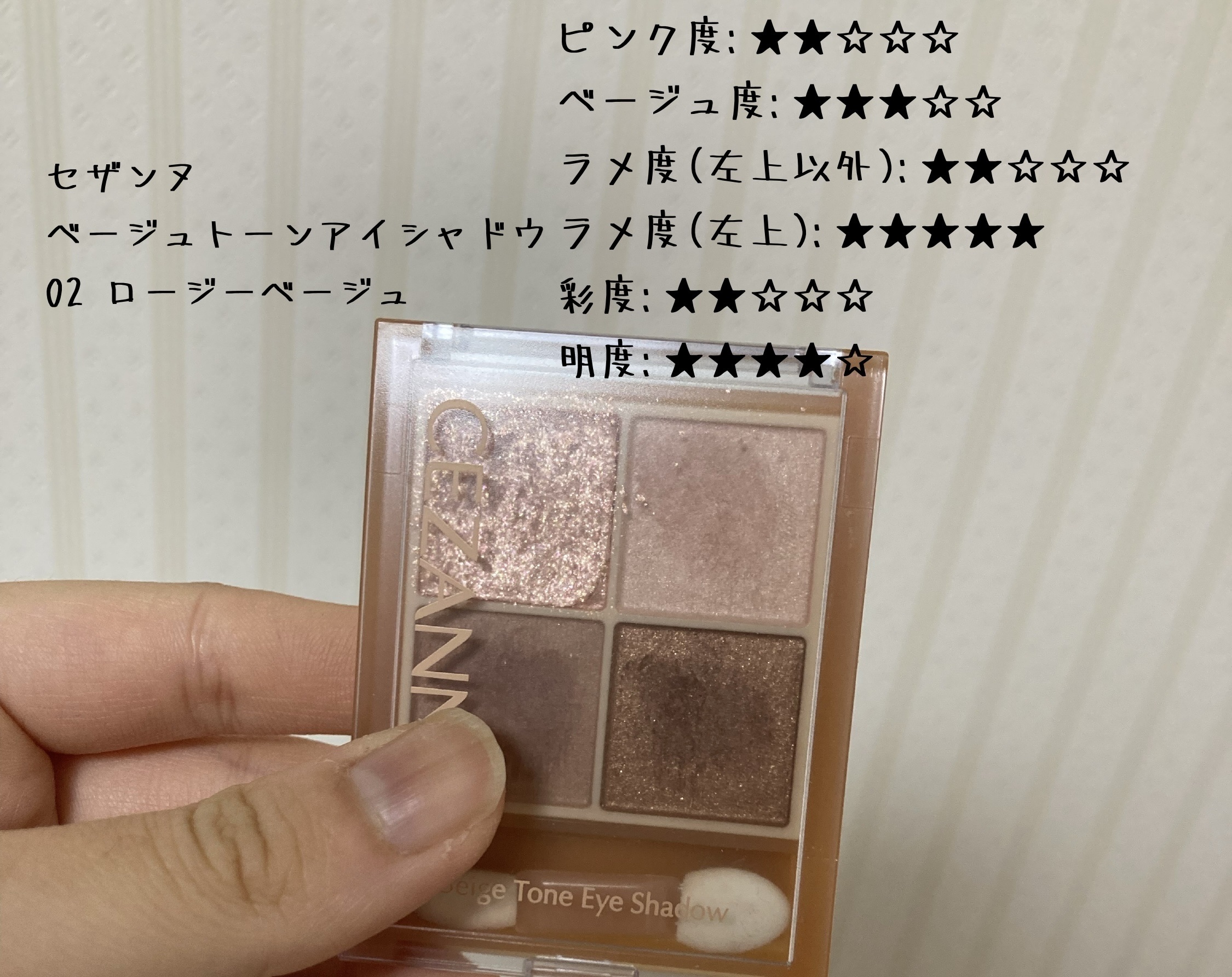 サラッとしてるけどピタッと密着。ラメ落ちは感じませんでした。 淡いです!濃いめが好きな人には物足りないかも💦逆にセザンヌのベージュトーンアイシャドウやビーアイドルのヌードベージュが好きな人はドンピシャだと思います! 派手すぎない色味 今のところなし