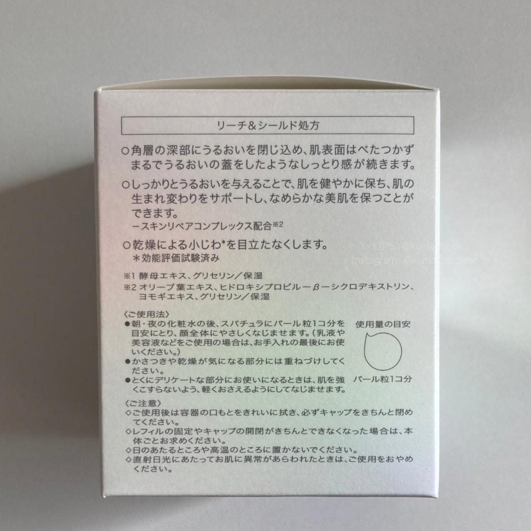 - 【医薬部外品】 薬用肌荒れ予防ケア。 肌荒れ?あわてる前に早めのリペアクリーム。 くり返しがちな肌荒れが気になる方に。 肌荒れ予防ケアとうるおい密封。 たっぷりのうるおいを与え、しっとりなめらかな美肌へ導くクリーム。 角層の深部にうるおいを閉じ込め、肌表面はべたつかず、まるでうるおいの蓋をしたようなしっとり感が続きます。 乾燥による小ジワ*1を目立たなくします。 スパチュラ付き。 ●厳選成分配合、クリーン製法 ●パラベン(防腐剤)フリー、アルコール(エチルアルコール)フリー ●無香料、無着色、弱酸性 ●低刺激設計。敏感肌の方のご協力によるパッチテスト済み*2 ●スティンギングテスト済み*2 ●朝・夜の化粧水の後、スパチュラにパール粒1コ分を目安にとり、顔全体にやさしくなじませます。 (乳液や美容液などをご使用の場合は、お手入れの最後にお使いください。) ●かさつきや乾燥が気になる部分には重ねづけしてください。 ●とくにデリケートな部分にお使いになるときは、肌を強くこすらないよう、軽くおさえるようにしてなじませます。 *1効能評価試験済 *2すべての方にアレルギーや皮ふ刺激がおきないわけではありません