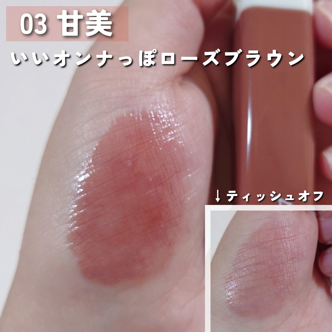 大好きすぎて2022のマイベスコスにも入れたティントです💕 103と114も可愛すぎて、特にイエベさん買ってほしい…🥺 上品な粘膜系カラーのピンクベージュ ちょっと青みがあるけど、イエベさんもいけるやつ(特にイエベ春) オンオフ問わず使えるナチュラルな色味💫 オレンジ寄りのテラコッタカラーで一気にあか抜けた印象に かと言って派手すぎない色味なので、使いやすい! オレンジメイクと相性◎ 写真で見るよりオレンジが濃いめかもです