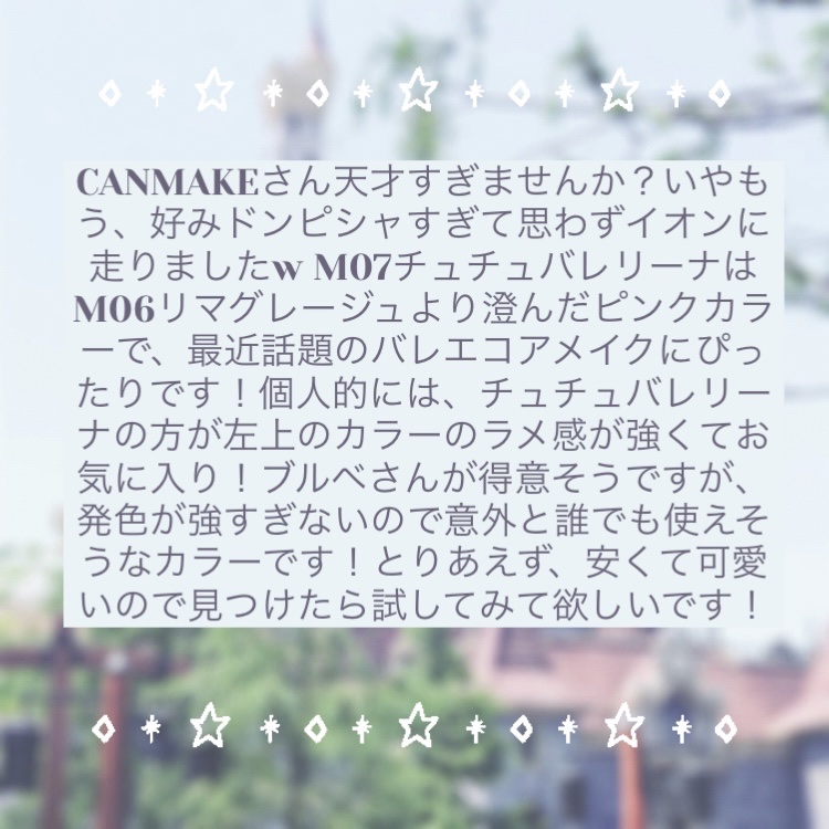 - <M07 チュチュバレリーナ> 【A】ジメチコン、タルク、トリ(カプリル酸/カプリン酸)グリセリル、(ジメチコン/ビニルジメチコン)クロスポリマー、カルナウバロウ、メチルパラベン、ラウロイルリシン、合成フルオロフロゴパイト、シリカ、トコフェロール、ホホバ種子油、アンズ核油、BG、水、ヒアルロン酸Na、カミツレ花エキス、硫酸Ba、マイカ、ホウケイ酸(Ca/Al)、酸化チタン、グンジョウ、酸化鉄、酸化スズ 【B+C+D】合成フルオロフロゴパイト、タルク、ジフェニルシロキシフェニルトリメチコン、水添ポリデセン、アルミナ、(イソステアリン酸ポリグリセリル-2/ダイマージリノール酸)コポリマー、ジメチコン、硫酸Ba、ジステアリン酸Al、メチルパラベン、ステアリン酸Mg、トコフェロール、ホホバ種子油、アンズ核油、シリカ、BG、水、ヒアルロン酸Na、カミツレ花エキス、水酸化Al、マイカ、酸化鉄、グンジョウ、酸化チタン