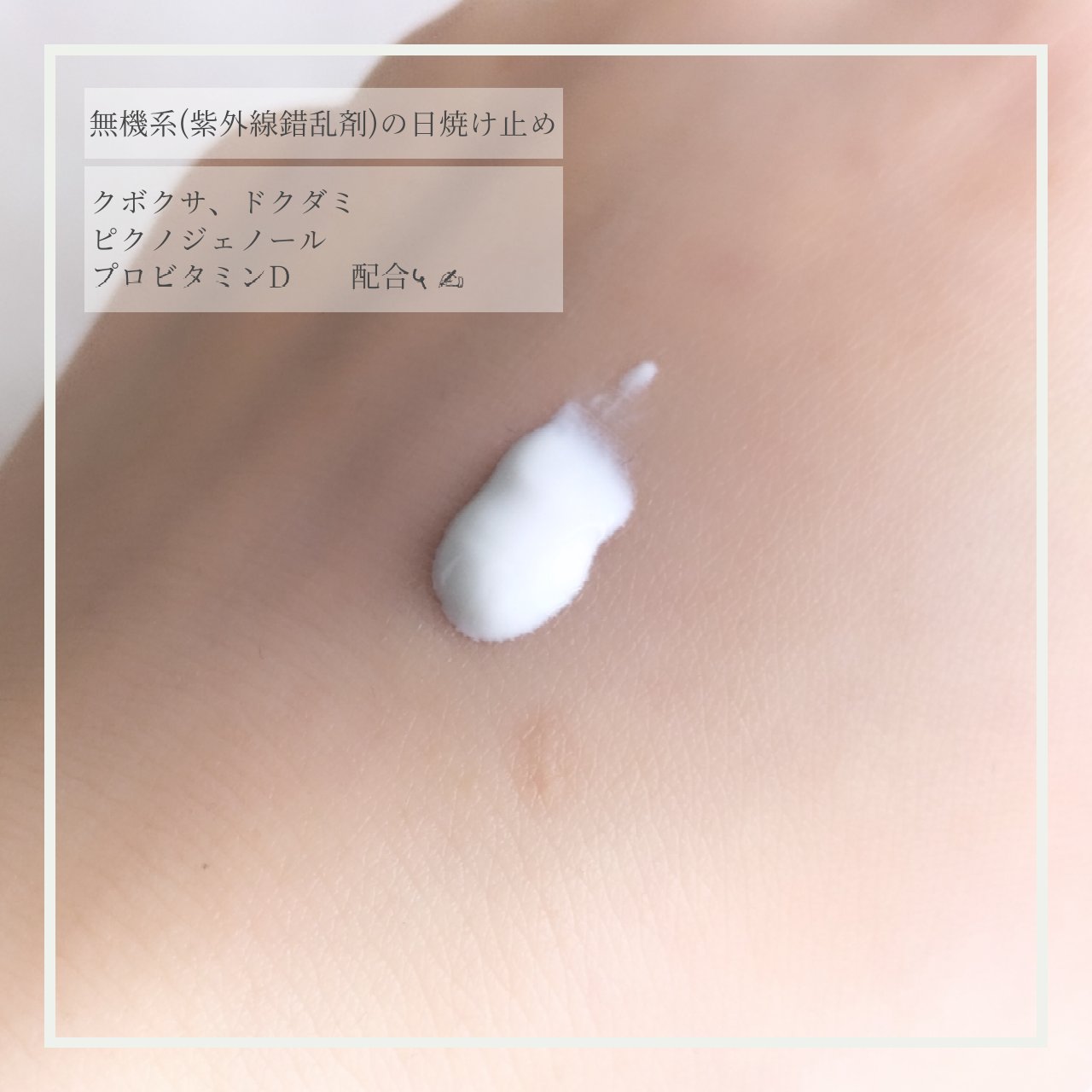- 肌への負担感の少ない使い心地でしっかり紫外線をカットする日焼け止めです。無機系(紫外線散乱剤)の日焼け止めなので、肌で光を跳ね返し、紫外線が肌に吸収されないようにします。 塗った瞬間から紫外線を反射し、白浮きしにくくモロモロも出にくいので化粧の邪魔にもなりません。 保湿成分もたくさん配合しており、ツボクサ*やドクダミ*は、肌を整え肌荒れを防ぎ、敏感な肌を乾燥などの外部の刺激から守ります。ピクノジェノール*は紫外線による刺激から肌を守り、プロビタミンD*は肌のバリア機能をサポートします。 *整肌成分