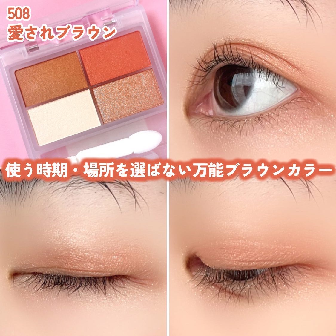 - シェードカラー・ミディアムカラー・ニュアンスカラー・スパークルカラーの4色が1つにまとまったメイクパレットです。 アイシャドウだけでなく、アイブロウやシェーディングとしても使えるカラーが入っているので、眉から目元まで、パレット1つでアイメイクが完成します。 カラーの組み合わせ次第でアレンジが広がり、様々なシーンに合わせたアイメイクを自在に楽しめます。 高密度ウレタン素材のチップ付きです。