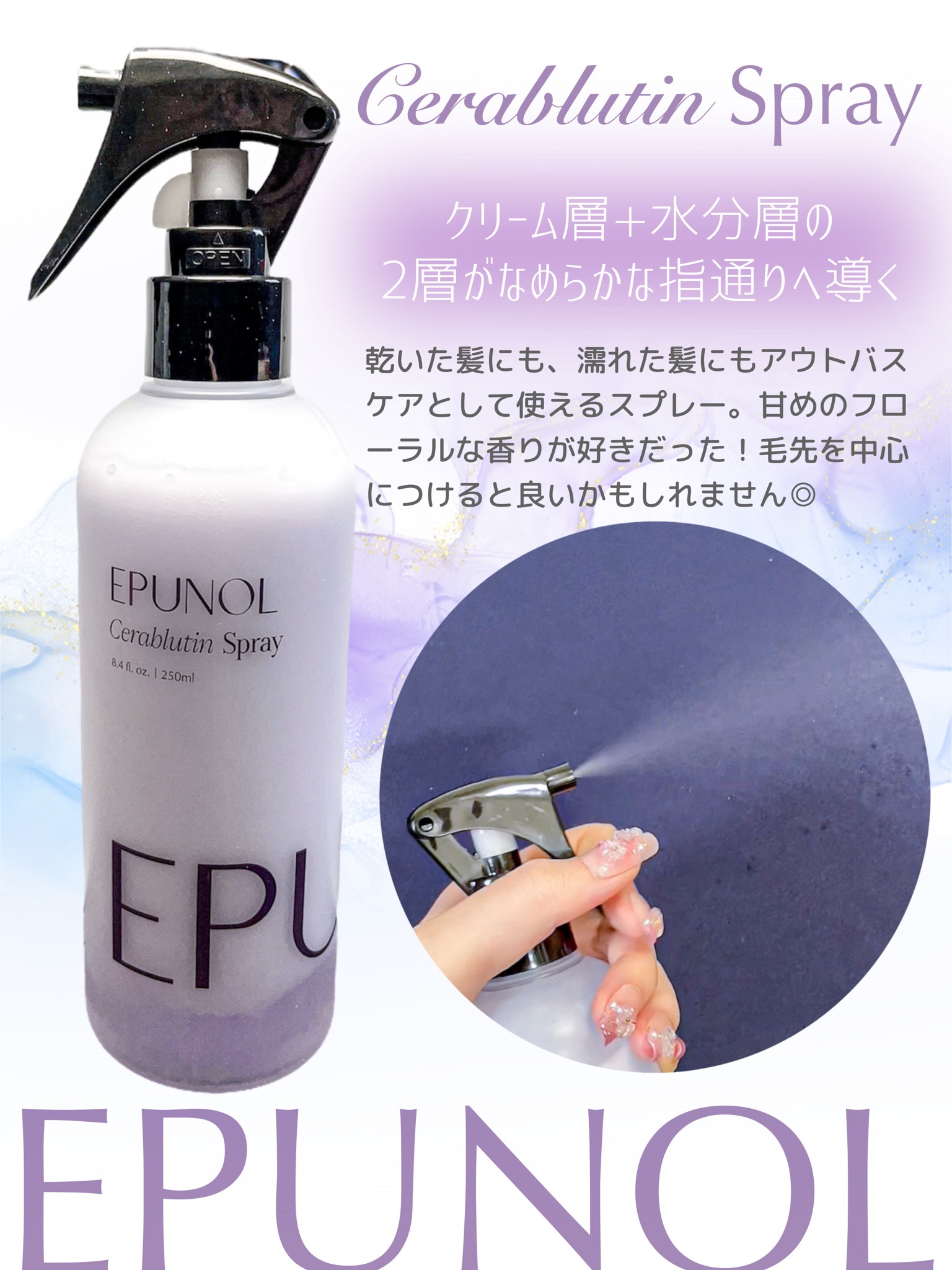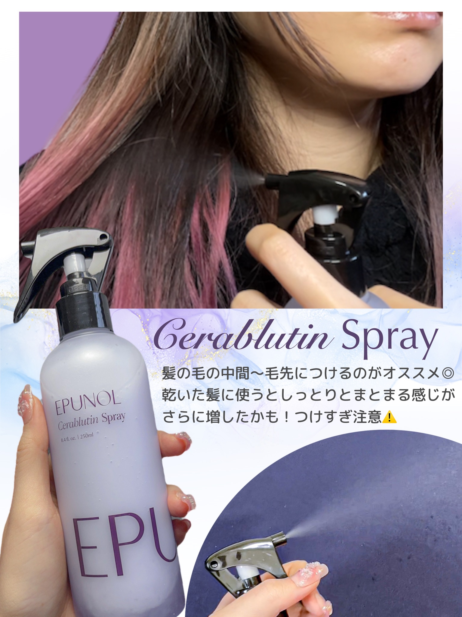 ヘアアイロンの熱から髪を保護するセラブルーチンスプレー!水分層と栄養クリームの二重構造になっていて、べたつかないヘアトリートメント✨ 最大230℃の熱保護効果で熱を加えれば加えるほど栄養成分が吸収される原理を利用したヘアトリートメントスプレー。 EPUNOL独自成分のセラブルーチン含有のダメージヘア専用高栄養淡白質エッセンスでサロン帰りのような髪に!