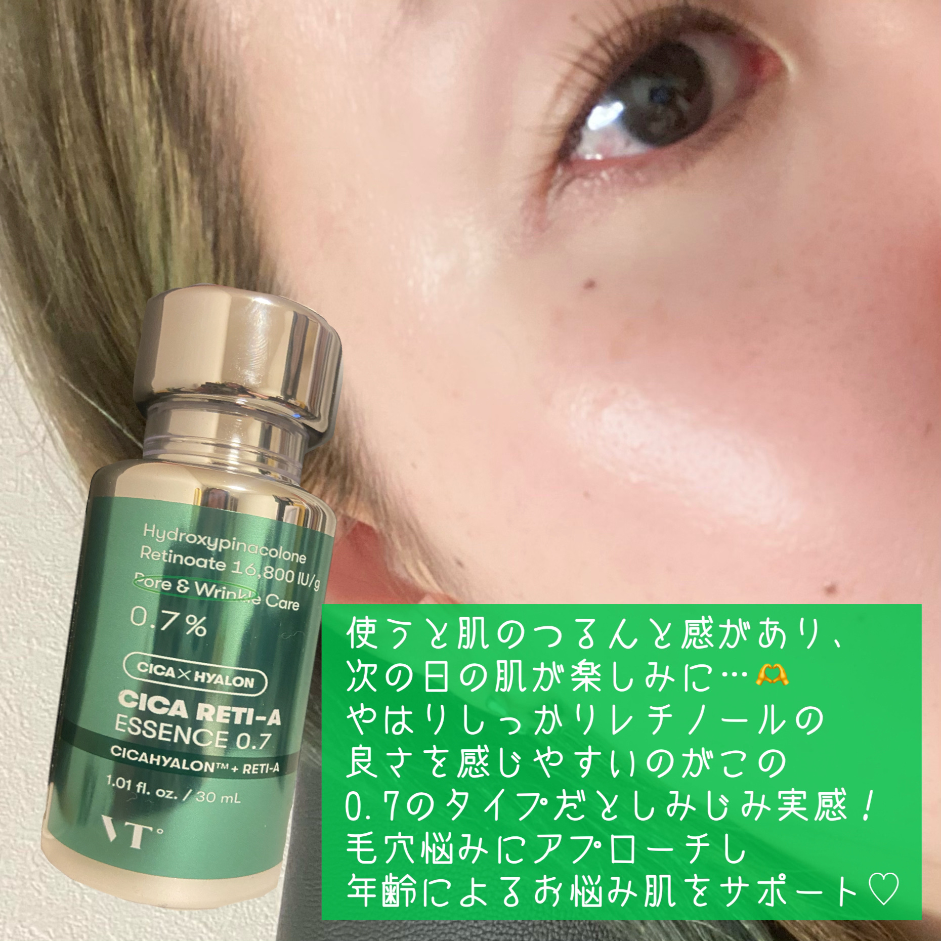 - レチノール成分*1を使ったことがある方へのエッセンス。 LHA成分*2配合で肌への刺激の少ない使い心地で、しっとり角層隅々までなじみキメ整った美肌へ導いてくれます。 更に天然由来の高純度BEAUACTIVE*3配合でハリを与え、健やかな素肌を保ちます。 "VTの高濃度*4シカレチノールシリーズで、肌レベルに合わせたソリューションを提案 #ハイレベル CICA RETI-A ESSENCE 0.7% 肌の角層隅々に潜む乾燥悩みまでエイジングケア*5 年齢肌を角質層からふっくらと潤いのあるなめらかな美肌に *1 整肌成分 *2 カプリロイルサリチル酸(整肌) *3 ヒドロキシステアリン酸(洗浄) *4当社従来品比 *5年齢に応じた手入れのこと