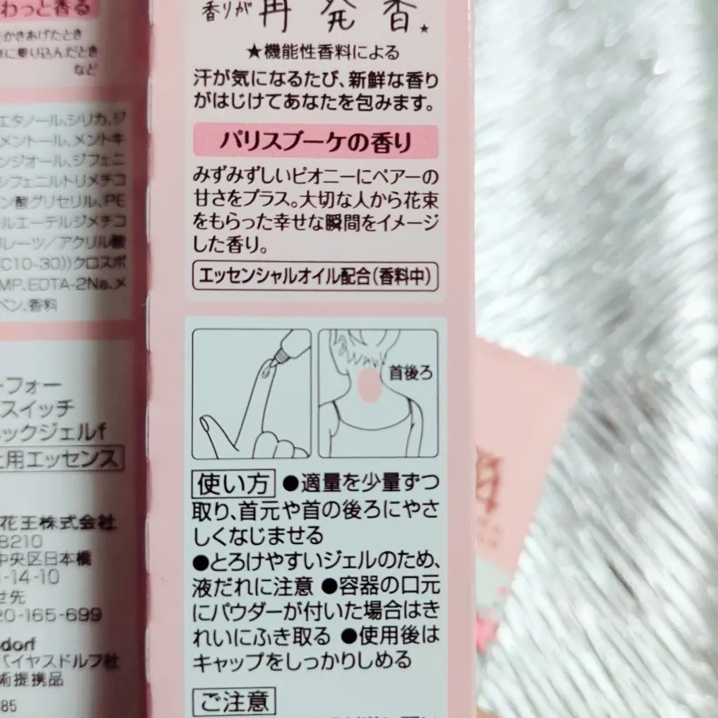 - 首のベタつきを抑え、髪の張り付きを防ぎます 汗が気になるたび、新鮮な香りがはじけてさらっと涼やか ●ジェルが肌をまもって整えます ●汗吸収さらさらパウダー(基剤)配合 肌になじんでドライベールをつくり、さらっと汗を乾かし続けます ●冷涼成分(冷感剤)配合 汗に反応して、ひんやりします ●汗が気になるたび香りが再発香(*2) 汗が気になるたび、新鮮な香りがはじけてあなたを包みます (*2)機能性香料によるカバーリング効果 ●摩擦に強く落ちにくいこすれプルーフ処方 ●携帯に便利なサイズ。約50回使えます ●海外の都市やシーンをイメージした3種類の香り いずれもエッセンシャルオイル配合(香料中)。 パリスブーケの香り:みずみずしいピオニーにペア一の甘さをプラス。大切な人から花束をもらった幸せな瞬間をイメージした香り
