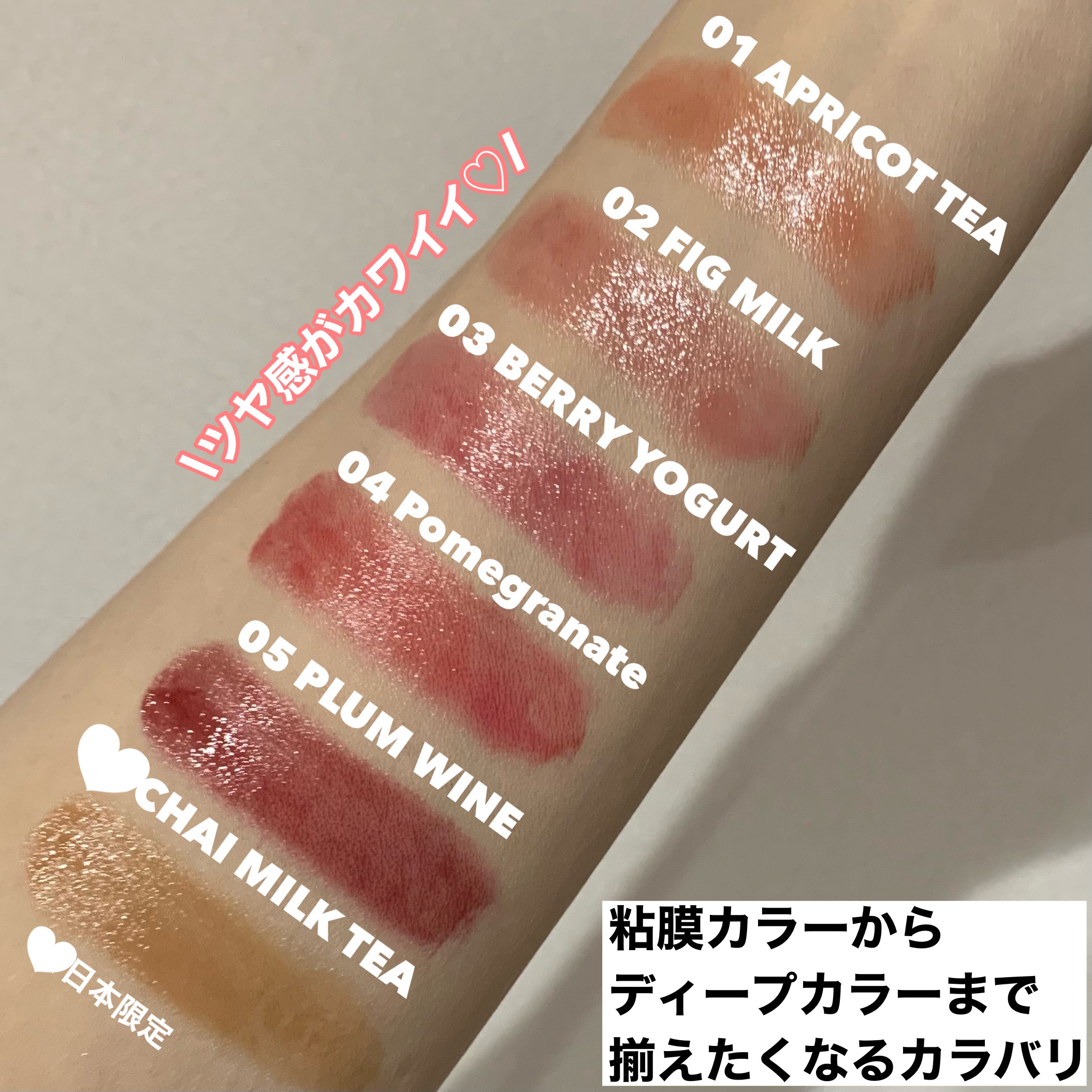 - <01 アプリコットティー> リンゴ酸ジイソステアリル、ダイマージリノール酸ダイマージリノレイルビス(ベヘニル/イソステアリル/フィトステリル)、ビスジグリセリルポリアシルアジペート-2、トリイソステアリン酸ポリグリセリル-2、水添ポリイソブテン、パラフィン、マイクロクリスタリンワックス、ウルシ果皮ロウ、ハチミツエキス、センチフォリアバラ花エキス、マンゴー果実エキス、カニナバラ果実エキス、アーモンド油、アルガニアスピノサ核油、アンズ核油、オリーブ果実油、シア脂、ツバキ種子油、ホホバ種子油、月見草油、BG、トリ(カプリル酸/カプリン酸)グリセリル、1,2-ヘキサンジオール、イソステアリン酸ソルビタン、酢酸トコフェロール、フェノキシエタノール、酸化鉄、酸化チタン、赤202、香料 <02 イチジクミルク> リンゴ酸ジイソステアリル、ダイマージリノール酸ダイマージリノレイルビス(ベヘニル/イソステアリル/フィトステリル)、ビスジグリセリルポリアシルアジペート-2、トリイソステアリン酸ポリグリセリル-2、水添ポリイソブテン、パラフィン、マイクロクリスタリンワックス、ウルシ果皮ロウ、ハチミツエキス、センチフォリアバラ花エキス、マンゴー果実エキス、カニナバラ果実エキス、アーモンド油、アルガニアスピノサ核油、シア脂、オリーブ果実油、アンズ核油、ツバキ種子油、ホホバ種子油、月見草油、BG、トリ(カプリル酸/カプリン酸)グリセリル、1,2-ヘキサンジオール、イソステアリン酸ソルビタン、酢酸トコフェロール、フェノキシエタノール、酸化鉄、酸化チタン、赤202、青1、香料 <03 ベリーヨーグルト> リンゴ酸ジイソステアリル、ダイマージリノール酸ダイマージリノレイルビス(ベヘニル/イソステアリル/フィトステリル)、ビスジグリセリルポリアシルアジペート-2、トリイソステアリン酸ポリグリセリル-2、水添ポリイソブテン、パラフィン、マイクロクリスタリンワックス、ウルシ果皮ロウ、ハチミツエキス、センチフォリアバラ花エキス、マンゴー果実エキス、カニナバラ果実エキス、アーモンド油、アルガニアスピノサ核油、シア脂、オリーブ果実油、アンズ核油、ツバキ種子油、ホホバ種子油、月見草油、BG、トリ(カプリル酸/カプリン酸)グリセリル、1,2-ヘキサンジオール、イソステアリン酸ソルビタン、酢酸トコフェロール、フェノキシエタノール、酸化鉄、酸化チタン、赤202、黄5、香料 <04 ザクロサワー> リンゴ酸ジイソステアリル、ダイマージリノール酸ダイマージリノレイルビス(ベヘニル/イソステアリル/フィトステリル)、ビスジグリセリルポリアシルアジペート-2、トリイソステアリン酸ポリグリセリル-2、水添ポリイソブテン、パラフィン、マイクロクリスタリンワックス、ウルシ果皮ロウ、ハチミツエキス、センチフォリアバラ花エキス、マンゴー果実エキス、カニナバラ果実エキス、アーモンド油、アルガニアスピノサ核油、シア脂、オリーブ果実油、アンズ核油、ツバキ種子油、ホホバ種子油、月見草油、BG、トリ(カプリル酸/カプリン酸)グリセリル、1,2-ヘキサンジオール、イソステアリン酸ソルビタン、酢酸トコフェロール、フェノキシエタノール、黄5、赤202、香料 <05 プラムワイン> リンゴ酸ジイソステアリル、ダイマージリノール酸ダイマージリノレイルビス(ベヘニル/イソステアリル/フィトステリル)、ビスジグリセリルポリアシルアジペート-2、トリイソステアリン酸ポリグリセリル-2、水添ポリイソブテン、パラフィン、マイクロクリスタリンワックス、ウルシ果皮ロウ、ハチミツエキス、センチフォリアバラ花エキス、マンゴー果実エキス、カニナバラ果実エキス、アーモンド油、アルガニアスピノサ核油、シア脂、オリーブ果実油、アンズ核油、ツバキ種子油、ホホバ種子油、月見草油、BG、トリ(カプリル酸/カプリン酸)グリセリル、1,2-ヘキサンジオール、イソステアリン酸ソルビタン、酢酸トコフェロール、フェノキシエタノール、酸化鉄、赤202、青1、香料 <06 チャイミルクティー> リンゴ酸ジイソステアリル、ダイマージリノール酸ダイマージリノレイルビス(ベヘニル/イソステアリル/フィトステリル)、ビスジグリセリルポリアシルアジペート-2、トリイソステアリン酸ポリグリセリル-2、水添ポリイソブテン、パラフィン、マイクロクリスタリンワックス、ハチミツエキス、センチフォリアバラ花エキス、マンゴー果実エキス、カニナバラ果実エキス、アーモンド油、アルガニアスピノサ核油、シア脂、オリーブ果実油、アンズ核油、ツバキ種子油、ホホバ種子油、月見草油、BG、トリ(カプリル酸/カプリン酸)グリセリル、水、1,2-ヘキサンジオール、イソステアリン酸ソルビタン、BHT、酢酸トコフェロール、フェノキシエタノール、酸化チタン、酸化鉄、香料 <21 ダーティチョコ> リンゴ酸ジイソステアリル、ダイマージリノール酸ダイマージリノレイルビス(ベヘニル/イソステアリル/フィトステリル)、ビスジグリセリルポリアシル