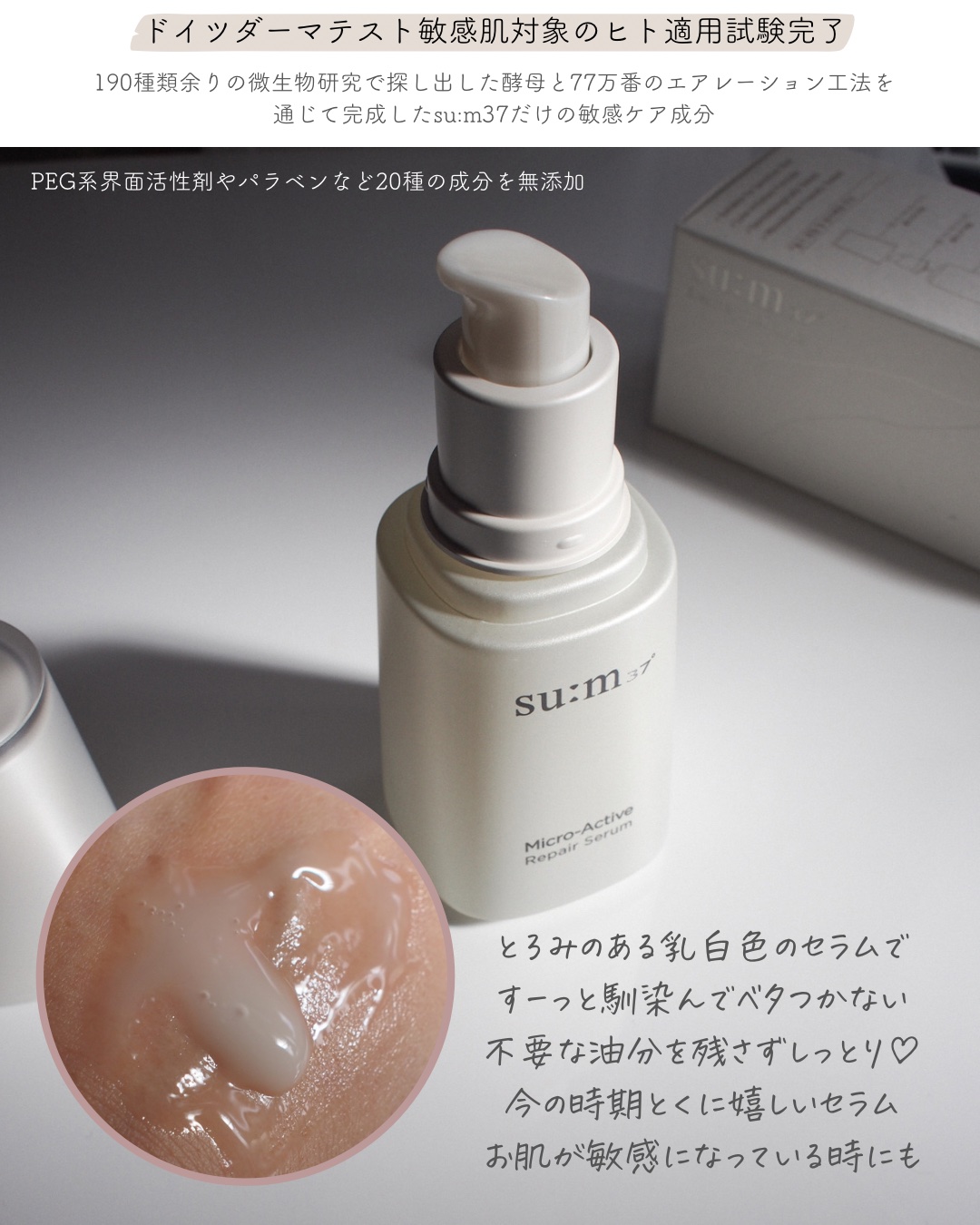 - 1つ1つを繊細に詰め込んだ10年発酵保湿成分Tru-ActiveとBiopeptide190を盛り込んだマイクロアクティブリペアセラムは生き生きとした印象であふれるような自然な艶肌に導きます。美しさの秘訣を追求するsu:m37°が見つけ出した自然・発酵の力。日々の外的刺激で敏感になった肌を繊細にケアするマイクロアクティブライン。明るい印象の輝くような肌へ。