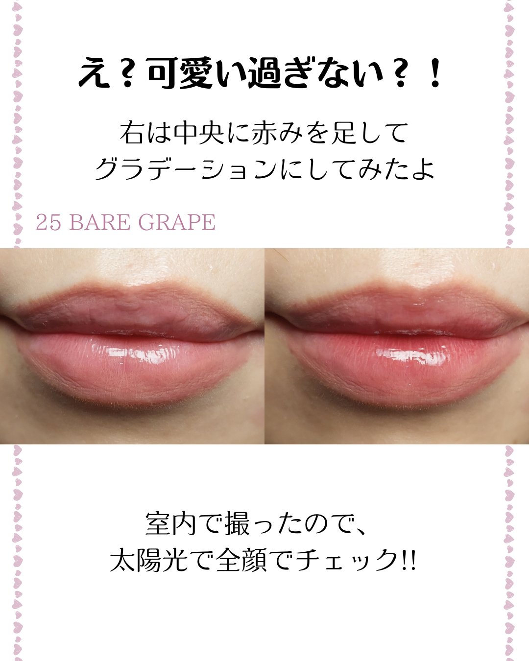 25番のBARE GRAPEは23番よりも青みが強く、ブルベ向き (特にブルベ夏)でした。 色持ちは塗り直し前提なら十分です。ティッシュオフしてもうっすら色が残り、強く擦っても取れません! カバンに一本入れておくと安心です。