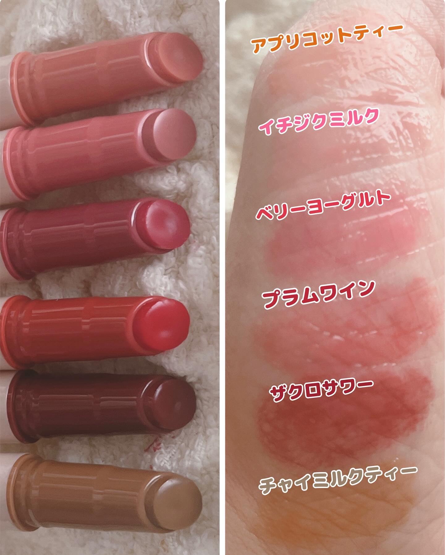 - <01 アプリコットティー> リンゴ酸ジイソステアリル、ダイマージリノール酸ダイマージリノレイルビス(ベヘニル/イソステアリル/フィトステリル)、ビスジグリセリルポリアシルアジペート-2、トリイソステアリン酸ポリグリセリル-2、水添ポリイソブテン、パラフィン、マイクロクリスタリンワックス、ウルシ果皮ロウ、ハチミツエキス、センチフォリアバラ花エキス、マンゴー果実エキス、カニナバラ果実エキス、アーモンド油、アルガニアスピノサ核油、アンズ核油、オリーブ果実油、シア脂、ツバキ種子油、ホホバ種子油、月見草油、BG、トリ(カプリル酸/カプリン酸)グリセリル、1,2-ヘキサンジオール、イソステアリン酸ソルビタン、酢酸トコフェロール、フェノキシエタノール、酸化鉄、酸化チタン、赤202、香料 <02 イチジクミルク> リンゴ酸ジイソステアリル、ダイマージリノール酸ダイマージリノレイルビス(ベヘニル/イソステアリル/フィトステリル)、ビスジグリセリルポリアシルアジペート-2、トリイソステアリン酸ポリグリセリル-2、水添ポリイソブテン、パラフィン、マイクロクリスタリンワックス、ウルシ果皮ロウ、ハチミツエキス、センチフォリアバラ花エキス、マンゴー果実エキス、カニナバラ果実エキス、アーモンド油、アルガニアスピノサ核油、シア脂、オリーブ果実油、アンズ核油、ツバキ種子油、ホホバ種子油、月見草油、BG、トリ(カプリル酸/カプリン酸)グリセリル、1,2-ヘキサンジオール、イソステアリン酸ソルビタン、酢酸トコフェロール、フェノキシエタノール、酸化鉄、酸化チタン、赤202、青1、香料 <03 ベリーヨーグルト> リンゴ酸ジイソステアリル、ダイマージリノール酸ダイマージリノレイルビス(ベヘニル/イソステアリル/フィトステリル)、ビスジグリセリルポリアシルアジペート-2、トリイソステアリン酸ポリグリセリル-2、水添ポリイソブテン、パラフィン、マイクロクリスタリンワックス、ウルシ果皮ロウ、ハチミツエキス、センチフォリアバラ花エキス、マンゴー果実エキス、カニナバラ果実エキス、アーモンド油、アルガニアスピノサ核油、シア脂、オリーブ果実油、アンズ核油、ツバキ種子油、ホホバ種子油、月見草油、BG、トリ(カプリル酸/カプリン酸)グリセリル、1,2-ヘキサンジオール、イソステアリン酸ソルビタン、酢酸トコフェロール、フェノキシエタノール、酸化鉄、酸化チタン、赤202、黄5、香料 <04 ザクロサワー> リンゴ酸ジイソステアリル、ダイマージリノール酸ダイマージリノレイルビス(ベヘニル/イソステアリル/フィトステリル)、ビスジグリセリルポリアシルアジペート-2、トリイソステアリン酸ポリグリセリル-2、水添ポリイソブテン、パラフィン、マイクロクリスタリンワックス、ウルシ果皮ロウ、ハチミツエキス、センチフォリアバラ花エキス、マンゴー果実エキス、カニナバラ果実エキス、アーモンド油、アルガニアスピノサ核油、シア脂、オリーブ果実油、アンズ核油、ツバキ種子油、ホホバ種子油、月見草油、BG、トリ(カプリル酸/カプリン酸)グリセリル、1,2-ヘキサンジオール、イソステアリン酸ソルビタン、酢酸トコフェロール、フェノキシエタノール、黄5、赤202、香料 <05 プラムワイン> リンゴ酸ジイソステアリル、ダイマージリノール酸ダイマージリノレイルビス(ベヘニル/イソステアリル/フィトステリル)、ビスジグリセリルポリアシルアジペート-2、トリイソステアリン酸ポリグリセリル-2、水添ポリイソブテン、パラフィン、マイクロクリスタリンワックス、ウルシ果皮ロウ、ハチミツエキス、センチフォリアバラ花エキス、マンゴー果実エキス、カニナバラ果実エキス、アーモンド油、アルガニアスピノサ核油、シア脂、オリーブ果実油、アンズ核油、ツバキ種子油、ホホバ種子油、月見草油、BG、トリ(カプリル酸/カプリン酸)グリセリル、1,2-ヘキサンジオール、イソステアリン酸ソルビタン、酢酸トコフェロール、フェノキシエタノール、酸化鉄、赤202、青1、香料 <06 チャイミルクティー> リンゴ酸ジイソステアリル、ダイマージリノール酸ダイマージリノレイルビス(ベヘニル/イソステアリル/フィトステリル)、ビスジグリセリルポリアシルアジペート-2、トリイソステアリン酸ポリグリセリル-2、水添ポリイソブテン、パラフィン、マイクロクリスタリンワックス、ハチミツエキス、センチフォリアバラ花エキス、マンゴー果実エキス、カニナバラ果実エキス、アーモンド油、アルガニアスピノサ核油、シア脂、オリーブ果実油、アンズ核油、ツバキ種子油、ホホバ種子油、月見草油、BG、トリ(カプリル酸/カプリン酸)グリセリル、水、1,2-ヘキサンジオール、イソステアリン酸ソルビタン、BHT、酢酸トコフェロール、フェノキシエタノール、酸化チタン、酸化鉄、香料 <21 ダーティチョコ> リンゴ酸ジイソステアリル、ダイマージリノール酸ダイマージリノレイルビス(ベヘニル/イソステアリル/フィトステリル)、ビスジグリセリルポリアシル