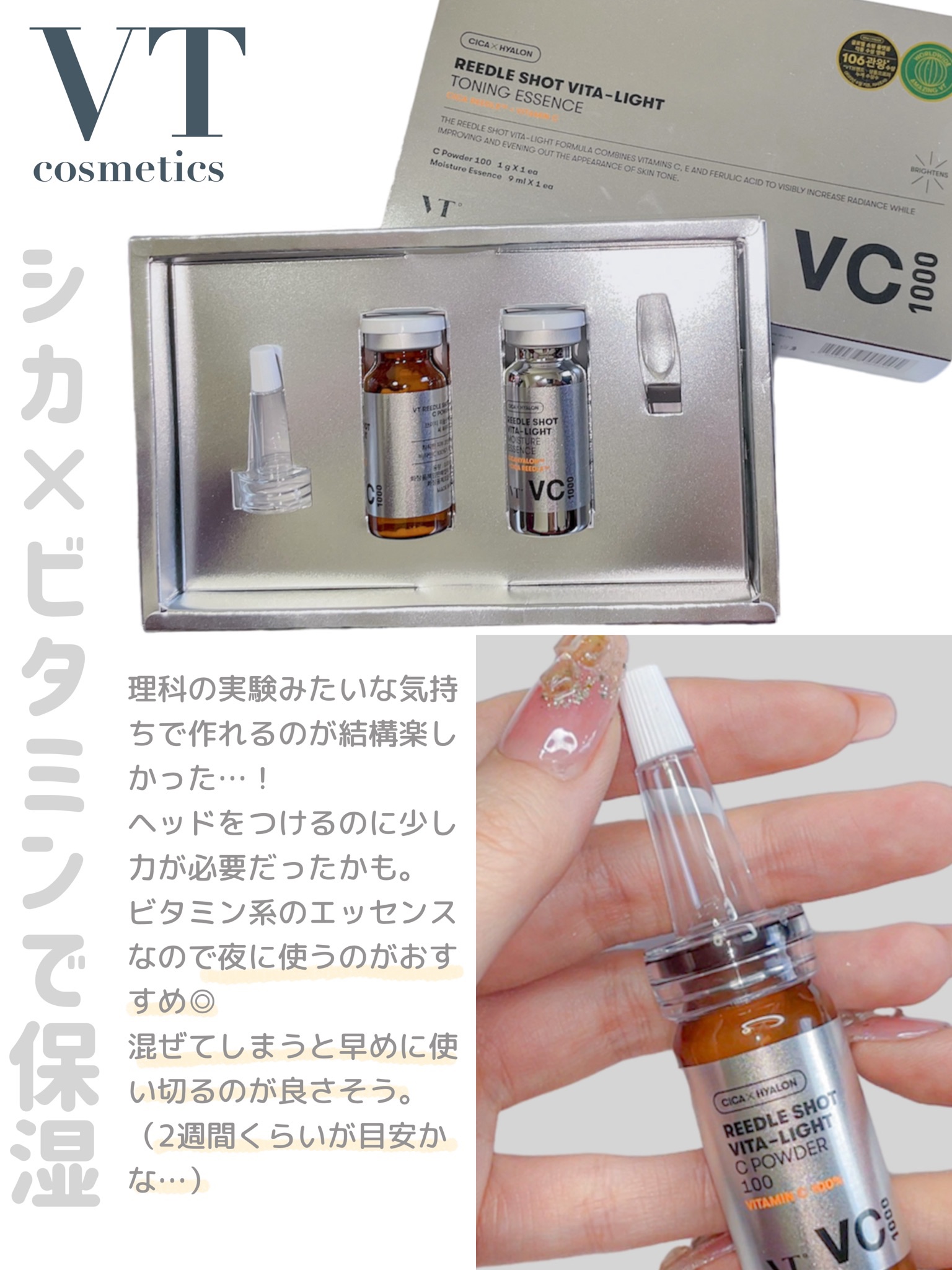 VTリードルショット100リードルショットビタライトCエッセンスパウダーと液体を混ぜて作る2液型のフレッシュなビタミンC美容液🍋1週間くらいで使い切れる小さいサイズで新鮮なまま使い切れるし、2液型だから混ぜるのも実験みたいで楽しい定番人気のリ...