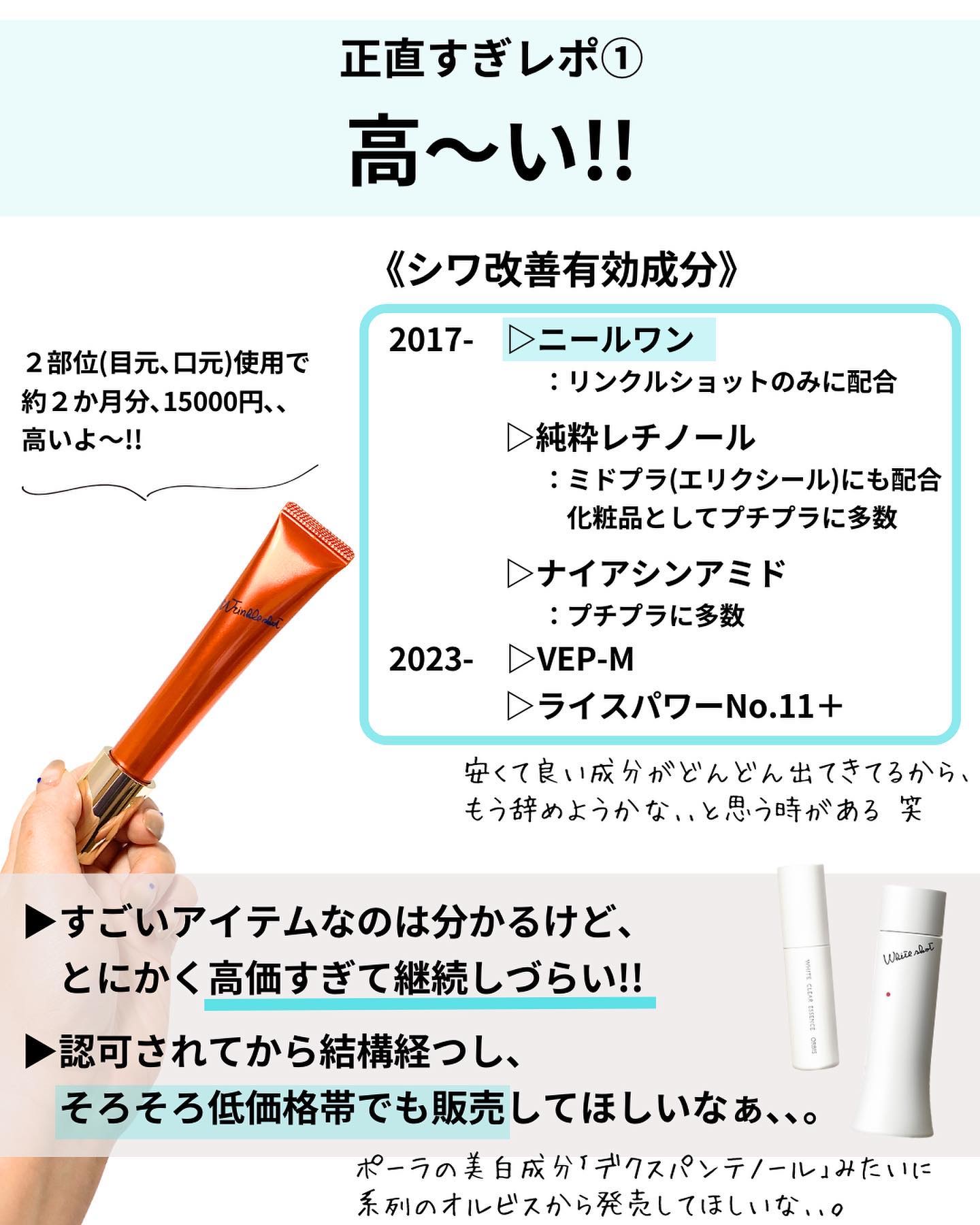 為になるレポをありがとうございます!とても魅力的ですね!使ってみたいですがやはり値段がネックですよね…この成分はPOLAさん独自ですよね?やはり他のシワ改善にアプローチする製品とは一線を画していてこちらがかなりすごいのでしょうか?使ってみたいです