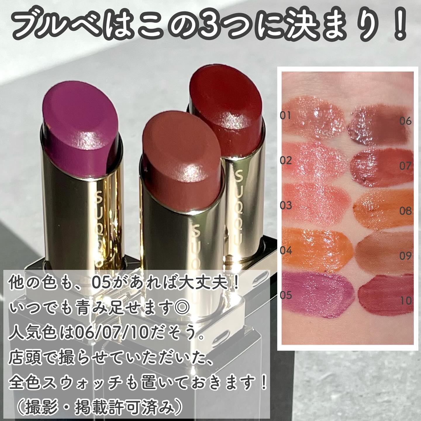 ひと塗りでシックかつモードなムードが漂う青みが強めのベリーピンク。モイスチャーグレイズリップスティックは潤うしつけ心地も好きでむっちりとした唇に💋青みもしっかりあってブルベ向けのベリーピンクSUQQUモイスチャーグレイズリップスティック#10...