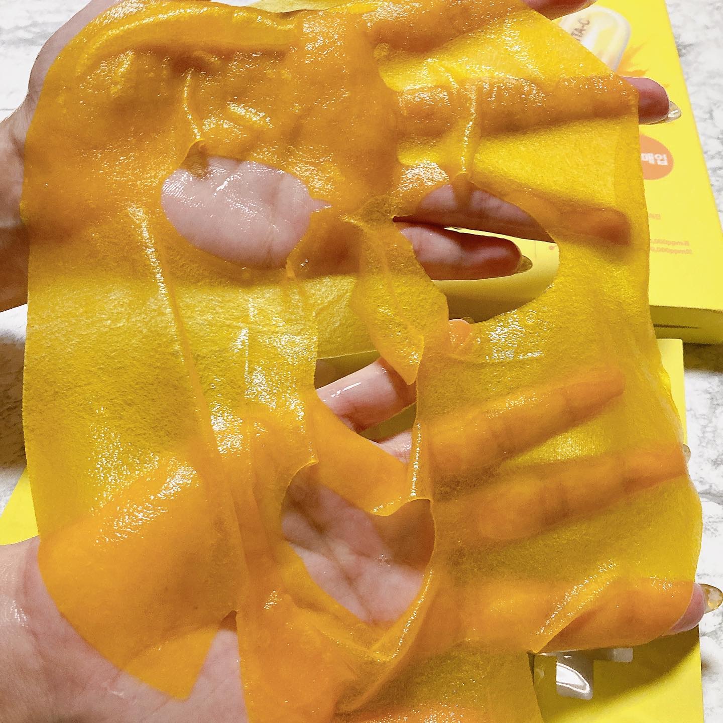 黄色くてピタッと張り付くシートが気持ち良くて大好き。 この黄色いシート、人工色素は使ってないんだって〜。ビタミンCパウダーをふりかけたシートなんだそう。 マスクがすっごくピタッと張り付くので、隙間なく成分がチャージされてる感じがめちゃくちゃ気に入ってます! 美白成分・水光成分・鎮静成分。肌が元気になる感じが好きなので、疲れたなーって時によく使っています。
