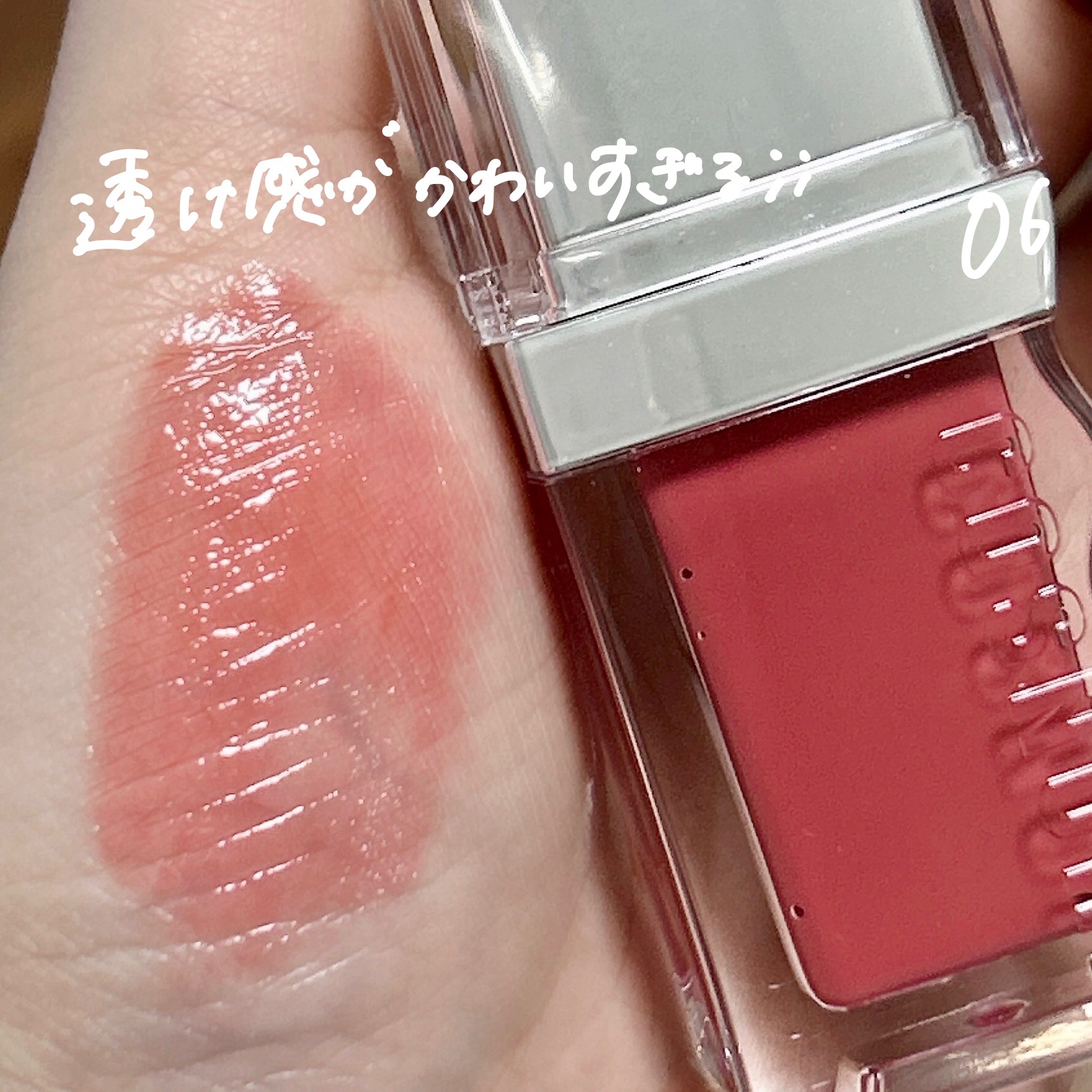 - <01 ソフィー(Surfy)> リンゴ酸ジイソステアリル、ジフェニルシロキシフェニルトリメチコン、精製水、ジフェニルジメチコン、ビスジグリセリルポリアシルアジペート-2、水添ポリイソブテン、ポリグリセリン-3、ポリソルベート60、セチルPEG/PPG-10/1ダイメチコン、イソステアリン酸ソルビタン、BG、ペンチレングリコール、1,2-ヘキサンジオール、ダイメジメチコン、アクリル酸ヒドロキシエチル/ナトリウムアクリロイルジメチルタウリン酸共重合体スクアラン、セテアレス-20、二酸化チタン、エチルヘキシルグリセリン、赤色227号、黄色5 号、香料、赤色104号(1)、水酸化酸化アルミニウム、ポリアクリル酸アンモニウム溶液、黄色4号、フェノキシエタノール、マカデミア種子油、ローズヒップ油、ツバキ油、トコフェロール <02 ピンクラッシュ(Pinkrush)> リンゴ酸ジイソステアリル、ジフェニルシロキシフェニルトリメチコン、精製水、ビスジグリセリルポリアシルアジペート-2、ジフェニルジメチコン、水添ポリイソブテン、ポリグリセリン-3、ポリソルベート60、セチルPEG/PPG-10/1ダイメチコン、イソステアリン酸ソルビタン、BG、ダイメジメチコン、ペンチレングリコール、1,2-ヘキサンジオール、アクリル酸ヒドロキシエチル/ナトリウムアクリロイルジメチルタウリン酸共重合体スクアラン、セテアレス-20、二酸化チタン、エチルヘキシルグリセリン、赤色227号、黄色5 号、香料、水酸化酸化アルミニウム、ポリアクリル酸アンモニウム溶液、フェノキシエタノール、マカデミア種子油、ローズヒップ油、ツバキ油、トコフェロール <03 グレア(Glare) > リンゴ酸ジイソステアリル、ジフェニルシロキシフェニルトリメチコン、精製水、ビスジグリセリルポリアシルアジペート-2、ジフェニルジメチコン、水添ポリイソブテン、ポリグリセリン-3、ポリソルベート60、セチルPEG/PPG-10/1ダイメチコン、イソステアリン酸ソルビタン、BG、ペンチレングリコール、1,2-ヘキサンジオール、ダイメジメチコン、アクリル酸ヒドロキシエチル/ナトリウムアクリロイルジメチルタウリン酸共重合体スクアラン、セテアレス-20、二酸化チタン、エチルヘキシルグリセリン、黄色5 号、香料、赤色104号(1)、赤色227号、水酸化酸化アルミニウム、ポリアクリル酸アンモニウム溶液、黄色4号、フェノキシエタノール、ブリリアントブルーFCF、マカデミア種子油、ローズヒップ油、ツバキ油、トコフェロール <04 ウィッティー(Witty)> リンゴ酸ジイソステアリル、ジフェニルシロキシフェニルトリメチコン、精製水、ビスジグリセリルポリアシルアジペート-2、ジフェニルジメチコン、水添ポリイソブテン、ポリグリセリン-3、ポリソルベート60、セチルPEG/PPG-10/1ダイメチコン、イソステアリン酸ソルビタン、BG、ダイメジメチコン、ペンチレングリコール、1,2-ヘキサンジオール、アクリル酸ヒドロキシエチル/ナトリウムアクリロイルジメチルタウリン酸共重合体スクアラン、セテアレス-20、二酸化チタン、黄色5 号、赤色227号、エチルヘキシルグリセリン、香料、水酸化酸化アルミニウム、ポリアクリル酸アンモニウム溶液、フェノキシエタノール、マカデミア種子油、ローズヒップ油、ツバキ油、トコフェロール <05 パンチ(Punch)> リンゴ酸ジイソステアリル、ジフェニルシロキシフェニルトリメチコン、精製水、ジフェニルジメチコン、ビスジグリセリルポリアシルアジペート-2、水添ポリイソブテン、ポリグリセリン-3、ポリソルベート60、セチルPEG/PPG-10/1ダイメチコン、イソステアリン酸ソルビタン、BG、ペンチレングリコール、1,2-ヘキサンジオール、ダイメジメチコン、アクリル酸ヒドロキシエチル/ナトリウムアクリロイルジメチルタウリン酸共重合体二酸化チタン、スクアラン、セテアレス-20、黄色5 号、エチルヘキシルグリセリン、香料、赤色227号、赤色104号(1)、水酸化酸化アルミニウム、ポリアクリル酸アンモニウム溶液、フェノキシエタノール、マカデミア種子油、ローズヒップ油、ツバキ油、トコフェロール <06 ディア(Dear)> リンゴ酸ジイソステアリル、ジフェニルシロキシフェニルトリメチコン、精製水、ジフェニルジメチコン、ビスジグリセリルポリアシルアジペート-2、水添ポリイソブテン、ポリグリセリン-3、ポリソルベート60、セチルPEG/PPG-10/1ダイメチコン、イソステアリン酸ソルビタン、BG、ペンチレングリコール、1,2-ヘキサンジオール、ダイメジメチコン、アクリル酸ヒドロキシエチル/ナトリウムアクリロイルジメチルタウリン酸共重合体スクアラン、セテアレス-20、二酸化チタン、エチルヘキシルグリセリン、黄色5 号、赤色227号、香料、水酸化酸化アルミニウム、黄色4号、ポリアクリル酸アンモニウム溶液、フェノキシエタノール、マカデミア種子油、ブリリアントブルーFCF、ローズヒップ油、ツバキ油、トコフェロール <07 カインド(Kind)> リンゴ酸ジイソステアリル、ジフェニルシロキシフェニルトリメチコン、精製水、ジフェニルジメチコン