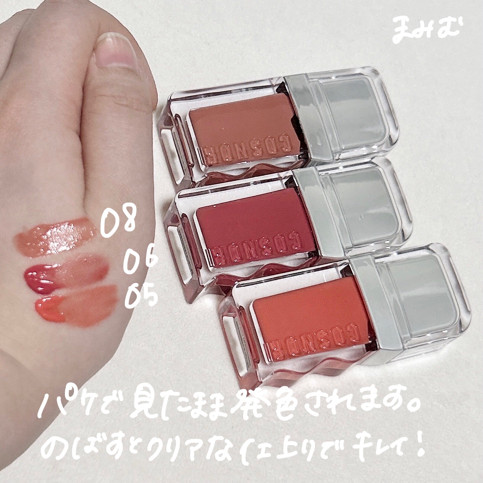 - クリアに満ち溢れる3層ガラス玉光沢がかわいい!コスノリからカラーリップが登場! 軽い付け心地なのにしっかりうるつや・ウォーターエッセンス38%とオイルのこだわりの配合率で、べたつかずに軽いフィッティングでツヤを演出します。 植物由来保湿オイルで唇にやさしい使い心地、しっとりした保湿効果が持続します。 1度塗りでシアーなナチュラルつや感、2.3度重ね塗りをすることで、ガラス玉のようなぽってり*うるツヤ唇へ導きます。 *メイク効果