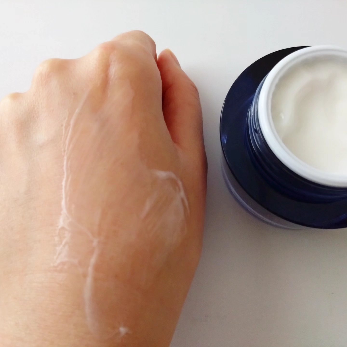 ディープブルーにゴールドの大人っぽいパッケージに入ったシワ改善、シミ予防のwの機能を兼ね備えたオールインワンクリームは、ゆるっとした乳液みたいな白いテクスチャーです。 みずみずしくしっとりするような使い心地で、香りは付いていないので、目元や鼻、口まわり、首までスキンケアしています。 50代の私が使っても手放したくなくなるような土台からのスキンケア。