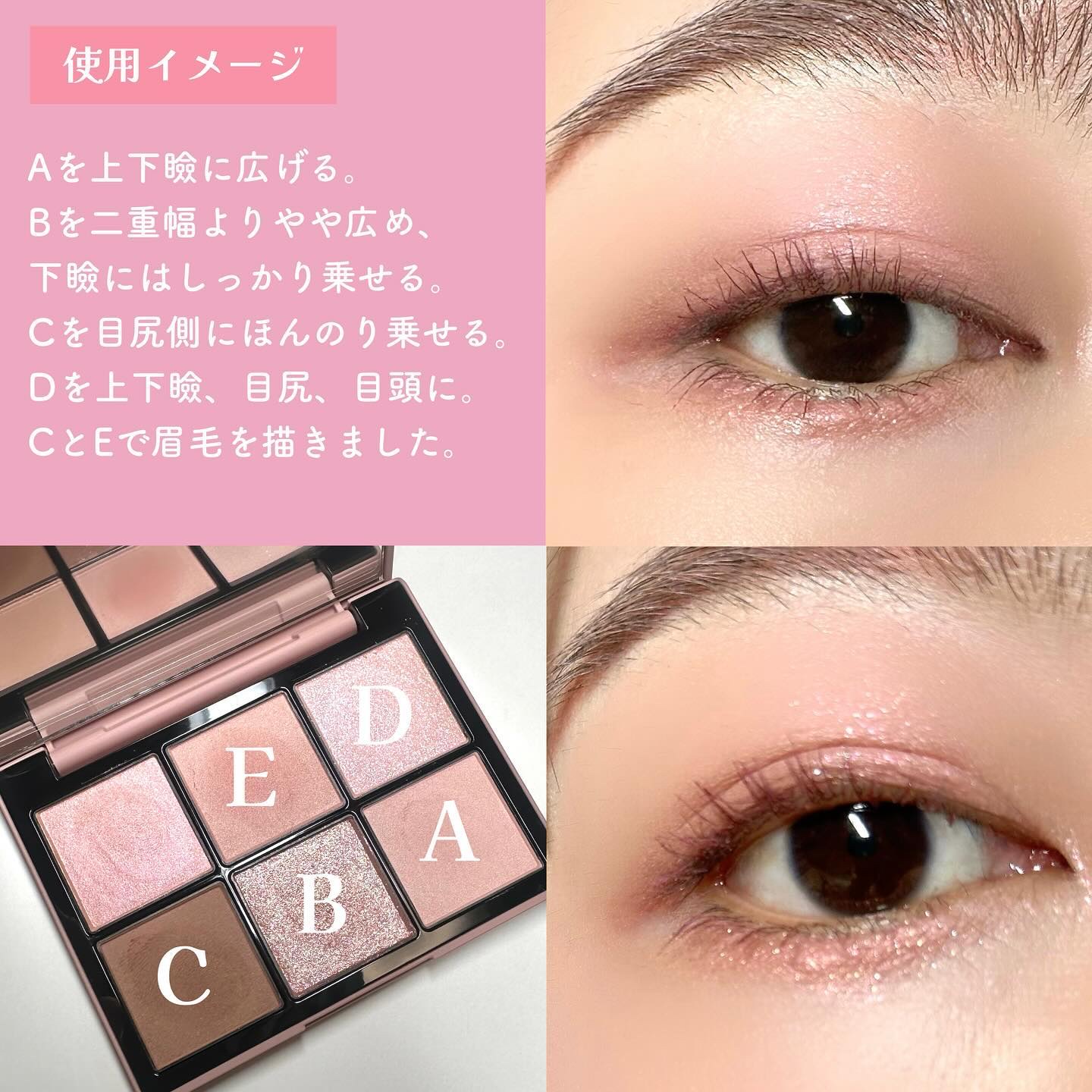 このパレットは、黄味が少なめでブルベにも使いやすいブラウン。 発色はしっかり目だけど、ブラシで調節も可能なので幅広い人に使いやすいパレットだと思います🎀✨ ラメ感も少しずつ異なり、華やかさを抑えたい時は右上を多めに使うと品の良いツヤのあるピンクブラウンメイクになります💎✨ 左上のラメカラーは白っぽいのでどんなアイシャドウとも相性抜群! この可愛い色味と煌びやかなラメは唯一無二です!