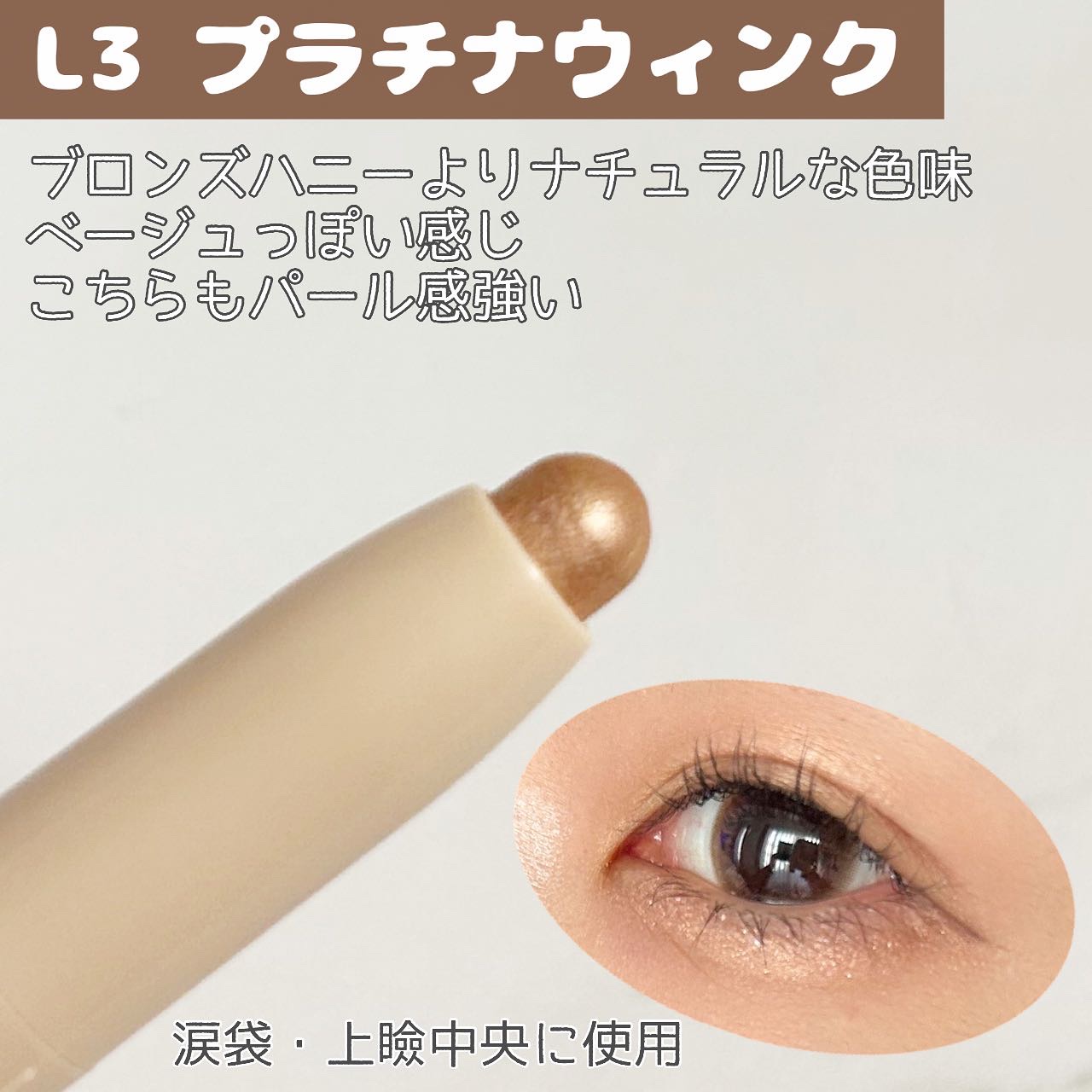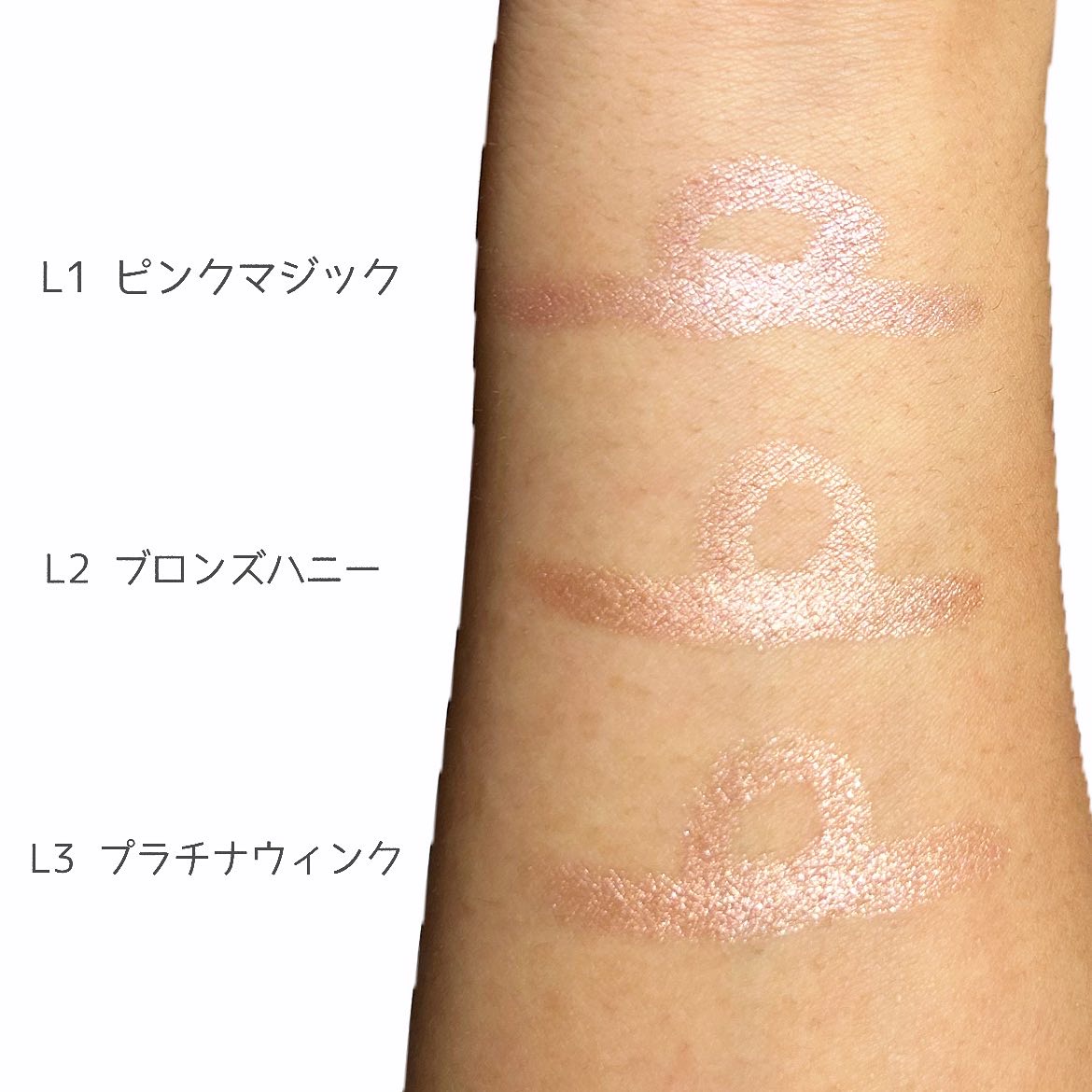 - <L1 ピンクマジック> イソドデカン、(メタクリル酸イソブチル/アクリル酸ビスヒドロキシプロピルジメチコン)コポリマー、カオリン、タルク、(スチレン/アクリレーツ)コポリマー、パルミチン酸エチルヘキシル、ダイマージリノール酸ジ(C20-40)アルキル、パラフィン、モンタン酸グリコール、合成ワックス、フェノキシエタノール、加水分解コラーゲン、加水分解シルク、ビオチノイルトリペプチド-1、パンテノール、加水分解ケラチン、[+/-]酸化チタン、マイカ、黄4、赤202、酸化鉄 <L2 ブロンズハニー> イソドデカン、(メタクリル酸イソブチル/アクリル酸ビスヒドロキシプロピルジメチコン)コポリマー、カオリン、タルク、(スチレン/アクリレーツ)コポリマー、パルミチン酸エチルヘキシル、ダイマージリノール酸ジ(C20-40)アルキル、パラフィン、モンタン酸グリコール、合成ワックス、フェノキシエタノール、加水分解コラーゲン、加水分解シルク、ビオチノイルトリペプチド-1、パンテノール、加水分解ケラチン、[+/-]酸化チタン、マイカ、黄4、赤202、酸化鉄 <L3 プラチナウィンク> イソドデカン、(メタクリル酸イソブチル/アクリル酸ビスヒドロキシプロピルジメチコン)コポリマー、カオリン、タルク、(スチレン/アクリレーツ)コポリマー、パルミチン酸エチルヘキシル、ダイマージリノール酸ジ(C20-40)アルキル、パラフィン、モンタン酸グリコール、合成ワックス、フェノキシエタノール、加水分解コラーゲン、加水分解シルク、ビオチノイルトリペプチド-1、パンテノール、加水分解ケラチン、[+/-]酸化チタン、マイカ、黄4、赤202、酸化鉄