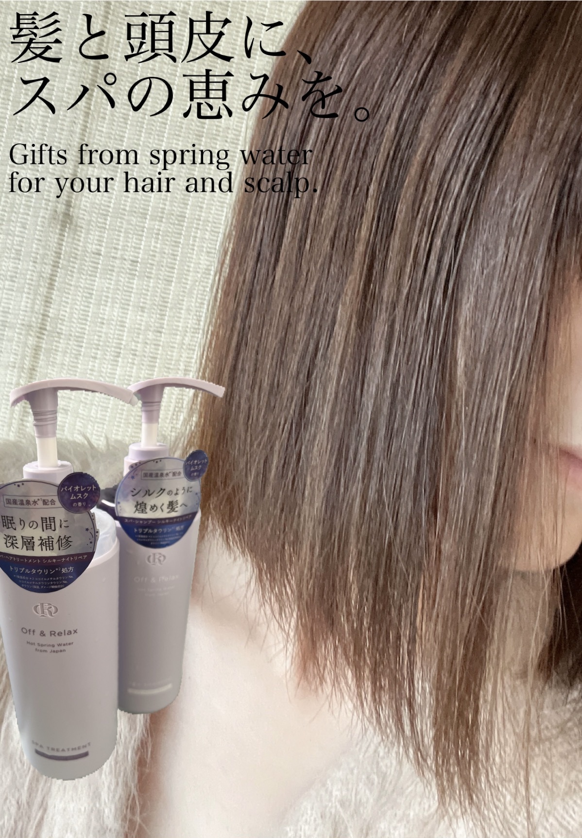 - Off&Relaxシルキーナイトリペアは髪のダメージ補修に特化したシリーズ。出雲・湯原・アルプスの3種の国産温泉水が頭皮と髪の汚れを優しく落とし、特別に配合されたトリプルタウリン※1が髪にハリ・コシを与えます。紫外線やパーマ、ヘアカラーからの髪ダメージを予防するヒートプロテクトテクノロジー※2を採用し、さらに五大保湿成分※3を配合して髪を芯から補修。キューティクルの整ったサロン帰りのような髪へ。オリジナルに調香したバイオレットムスクの香りは、まるで雨上がりの夜の花屋敷から漂う、咲き誇る花々の初々しくも、どこか神秘的で蠱惑的な香りがあなたのバスルームを包み込みます。 ※1ココイルメチルタウリンNa、ココイルメチルタウリンタウリンNa、タウリン※2メドウフォーム-δ- ラクトン配合によるダメージ補修のこと※3ユズセラミド、コエンザイムQ10、トレハロース、ヒアルロン酸、大豆タンパク