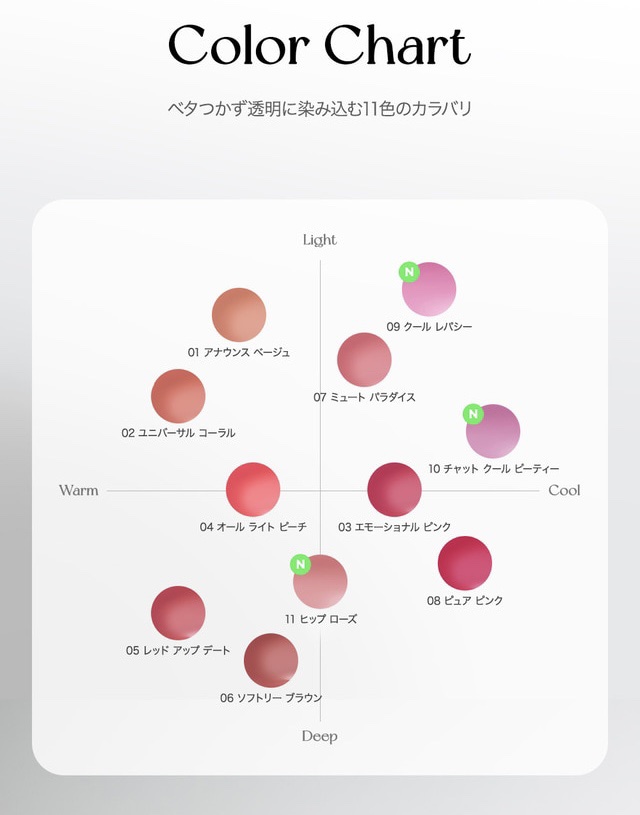 - 唇にぴたっ!長時間クリアな血色感が続く*しっとり感を閉じ込めて、乾燥のしにくい丁度いいツヤ感のナチュラルツヤリップに水分とオイルの黄金比率で、穏やかに揺れる波のような水分テクスチャー *当社調べ、個人差があります。 <01 アナウンス ベージュ(ANNOUNCE BEIGE)> イエベ春~秋にぴったりな、杏子ベージュ ベース(イエベ春&秋) <02 ユニバーサル コーラル(UNIVERSAL CORAL)> トーンを選ばない、クリアなコーラルカラー(イエベ春) <03 エモーショナル ピンク(EMOTIONAL PINK)>SOUL SOULがクールになるブルベ夏ピンク(ブルベ夏&ミュート) <04 オール ライト ピーチ(ALL RIGHT PEACH)> イエベ春ライトの顔色がパッと明るくなる、ブライト ピーチ(イエベ春ライト) <05 レッド アップデート(RED UPDATE)> イエベ秋にぴったりな、クリアなレッド(イエベ秋) <06 ソフトリー ブラウン(SOFTLY BROWN)> クリアに発色する、ブリックビーンカラー(イエベ秋ミュート) <07 ミュート パラダイス(MUTE PARADISE)> クールな温度を身に着けたクールベースカラー(ブルベ夏ミュート)