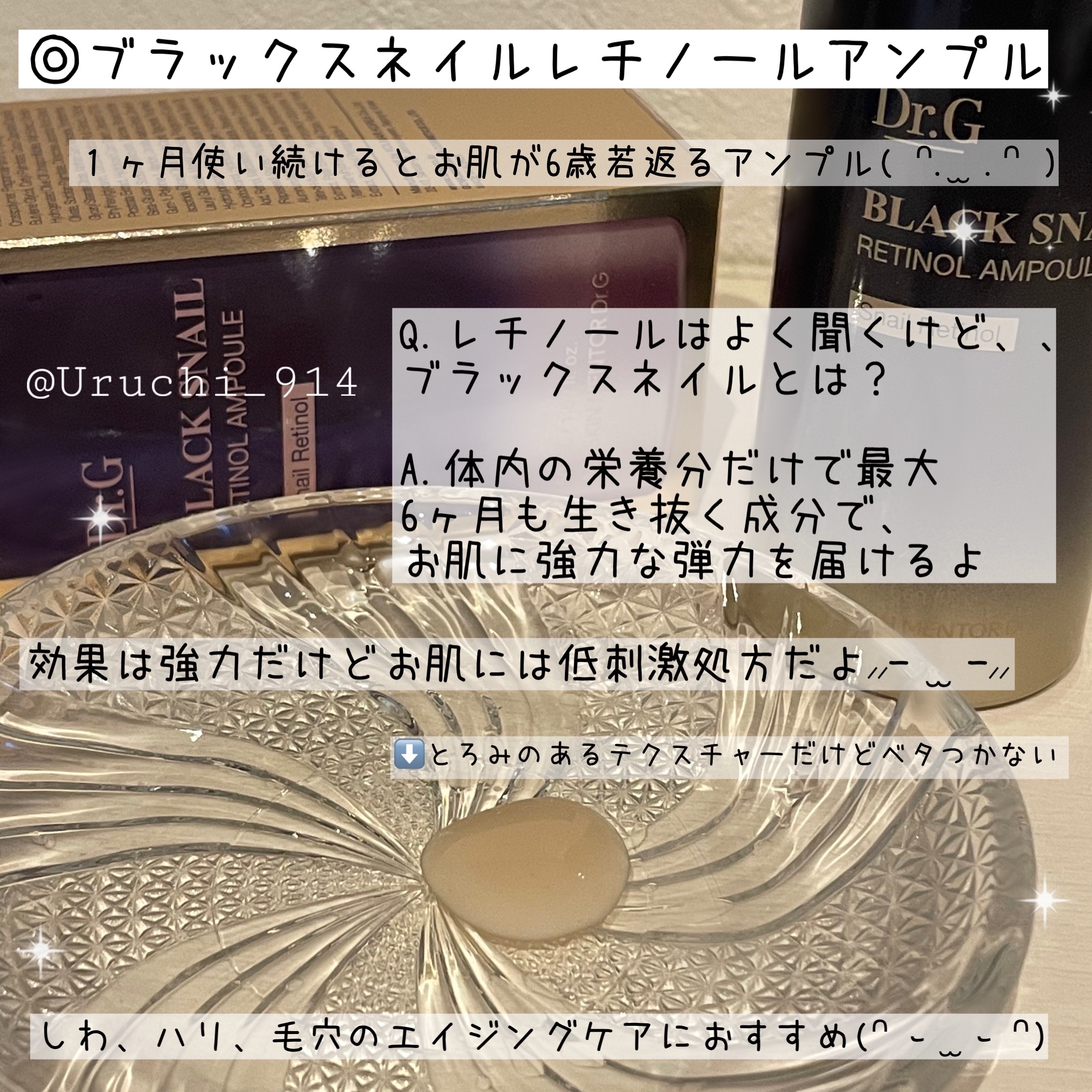 - ブラックスネイル*とレチノール*を配合した、若々しい肌印象に導く美容液です。 Dr.Gのレチノールは独自の成分である、ブラックスネイルレチノール*を使っています! 肌に高い保湿感を与え、肌のキメを整え、弾力やハリのケアを助けるだけでなく、肌の乾燥くすみをケアし、明るい印象のぷるんっとハリのある肌に導きます。 *整肌成分