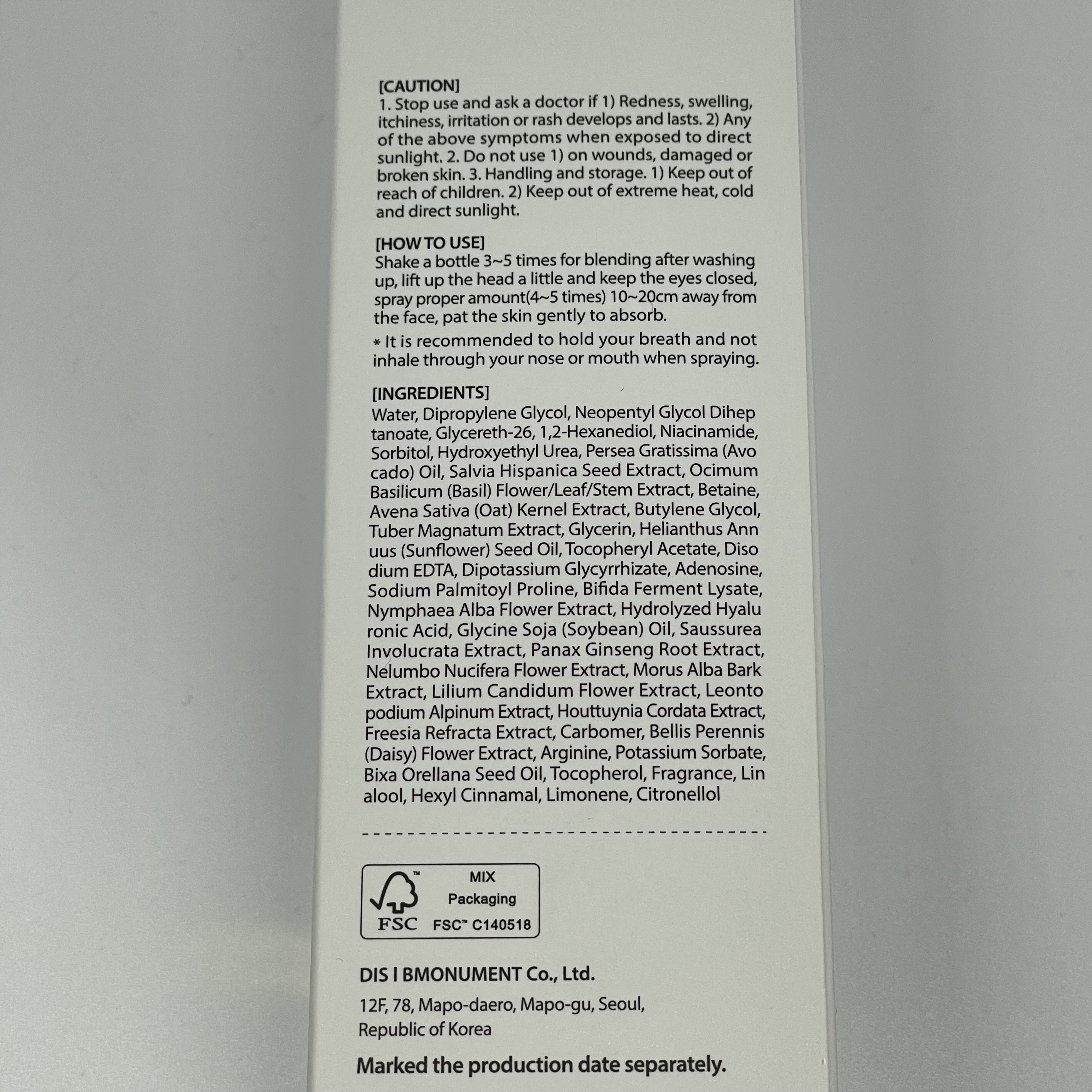 - <100ml> 水、BG、グリセリン、ソルビトール、加水分解ヒアルロン酸、カルボマー、香料、トコフェロール、グリチルリチン酸2K、アルギニン、ドクダミエキス、サルビアヒスパニカ種子エキス、DPG、ベタイン、ダイズ油、酢酸トコフェロール、1,2-ヘキサンジオール、ソルビン酸K、ヒマワリ種子油、EDTA-2Na、ヒナギク花エキス、ナイアシンアミド、リモネン、リナロール、シトロネロール、アデノシン、グリセレス-26、ヒドロキシエチルウレア、エーデルワイスエキス、ビフィズス菌培養溶解質、パルミトイルプロリンNa、ニンファエアアルバ花エキス、ジヘプタン酸ネオペンチルグリコール、ハス花エキス、カラスムギエキス、フリージアエキス、メボウキ花/葉/茎エキス、サウスレアインボルクラタエキス、マグワ樹皮エキス、マドンナリリー花エキス、ヘキシルシンナマル、ベニノキ種子油、アボカドオイル、ツベルマグナツムエキス(1、740ppm)、サンシチニンジン根エキス