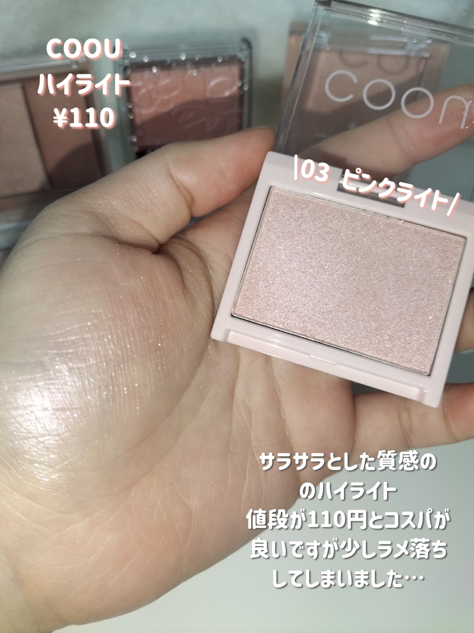 ピンク系ハイライト比較(プチプラ)ピンク系ハイライトはチークの上から使ったり唇の上に付けたり、涙袋に乗せたりするのに便利でよく使います。筆が付いていたりクリーム状だったりパウダーだったりいろいろあります。私は、毛がつくのが嫌なのでクリームは基...