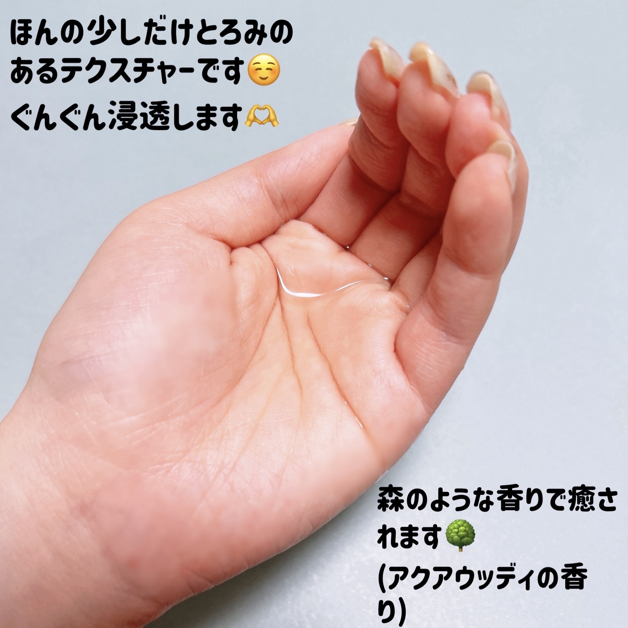 ベタつき感なくサラっとみずみずしいテクスチャーとさっぱりとしてながらしっとり潤い保湿力も◎ 毛穴の約1万分の1サイズの高浸透ナノカプセルを配合し角層すみずみまでうるおいを巡らせます みずみずしさと自然豊かな森の中に包み込まれるようなアクアウッディの香りでマインドフルネスなひと時へ〜