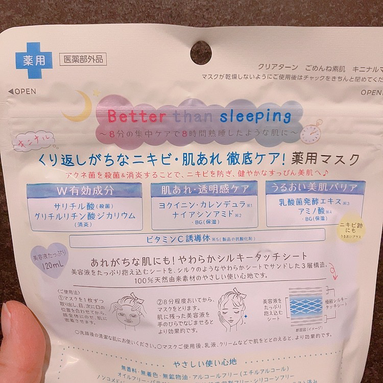 全部使い切ったけど、正直に言うと、うーん…って感じ この金額ならもっといいマスクあるよね…? 使用感大事な私は、このパックの素材がそもそも合わなくて、パックつけた時の気持ちい〜って感じが無いのが残念 唯一キニナルマスクは着け心地割とすきだったんだけど、これをつけてる時だけ何故かTゾーンがめちゃくちゃ乾燥して 鎮静に特化してる分、保湿はイマイチだったのかな、と感じました 絵とか可愛くて買った時はテンション上がるけどリピはないかなあ…