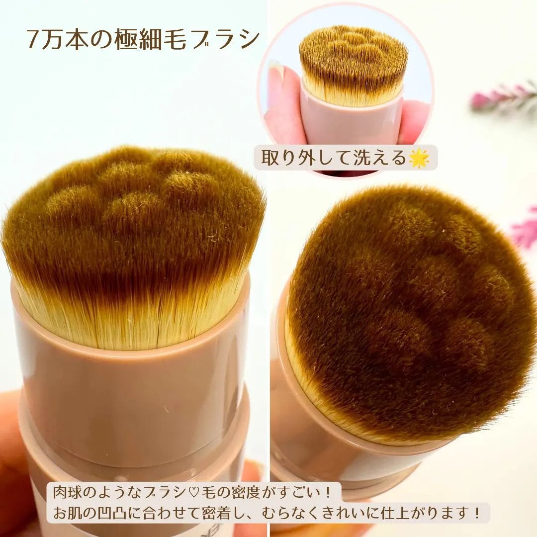 - 「こんなの欲しかった!」 ブラシ一体型の新感覚スティックファンデーション 素肌をアップデートした自然な美肌に。 ブラシ付きでいつでもどこでも簡単きれいに仕上がるきれいのお守り「スティックファンデーション」 point1:ブラシ一体型のスティックファンデーション持ち運びに便利なスティックタイプ。 ブラシ付きで手を汚さず簡単にベースメイクを仕上げることができます。ブラシは取り外し可能で交換・洗浄ができ、衛生的です。 point2:7万本の極細毛ブラシで完成度の高いメイクが実現!立体型の肉球ブラシがお肌の凹凸に合わせて密着し、小鼻や毛穴の気になる部分もムラなくきれいに仕上げることができます。 point3:紫外線ダメージによる乾燥、大気汚染などの外的刺激からお肌を守る植物エキス*配合 *カンゾウ根エキス、ドクダミエキス、オウゴン根エキス、アイブライトエキス(全て保湿成分)