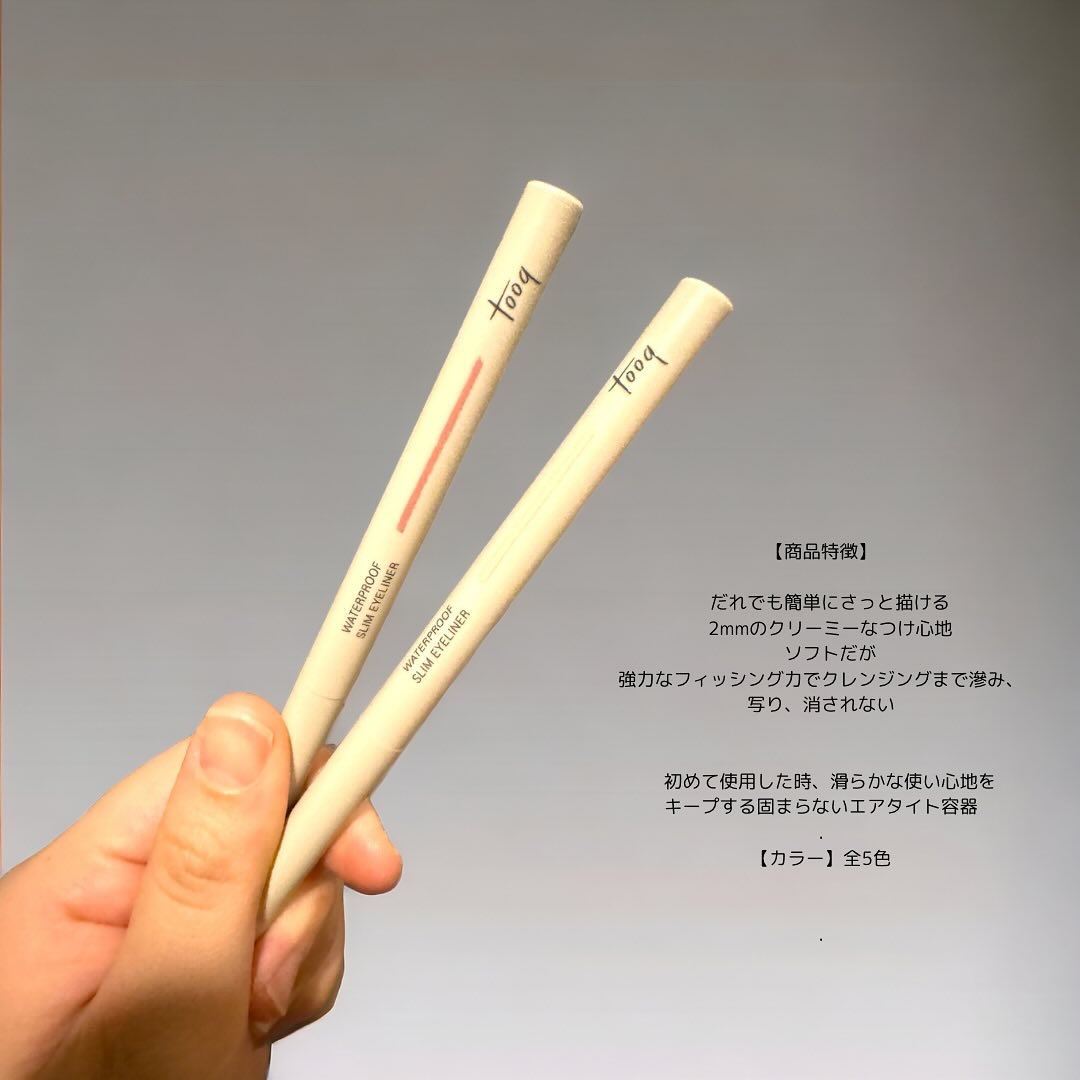 - トゥークならではの特別工法で作られたウォータープルーフ&オイルプルーフアイライナー。 2mmのスリムな厚さで繊細で完成度が高く、にじまない強力な固定力があります。 シャワー時にこすっても落ちないほど汗と油分に強いように製作してます。 カラーは全10種類で、奥ゆかしい目元表現と奥妙に見えるカラーで目元を自然に拡張してくれます。 そのうちシグネチャーカラーであるトゥークベージュは自然に目を拡張できるカラーで、粘膜に塗って切開メイクで使われます。 なめらかなつけ心地でヨレにくいです。 新カラーのトファサーモンは薄いピンクにアプリコットカラーが混ざって自然でふっくらした涙袋を作ってくれる魅力的な人気カラーです。 また、外部の空気が流入しない特許を取得したエアタイト容器で簡単に固まらず、初めて使用する時のような柔らかいつけ心地を維持してくれます。