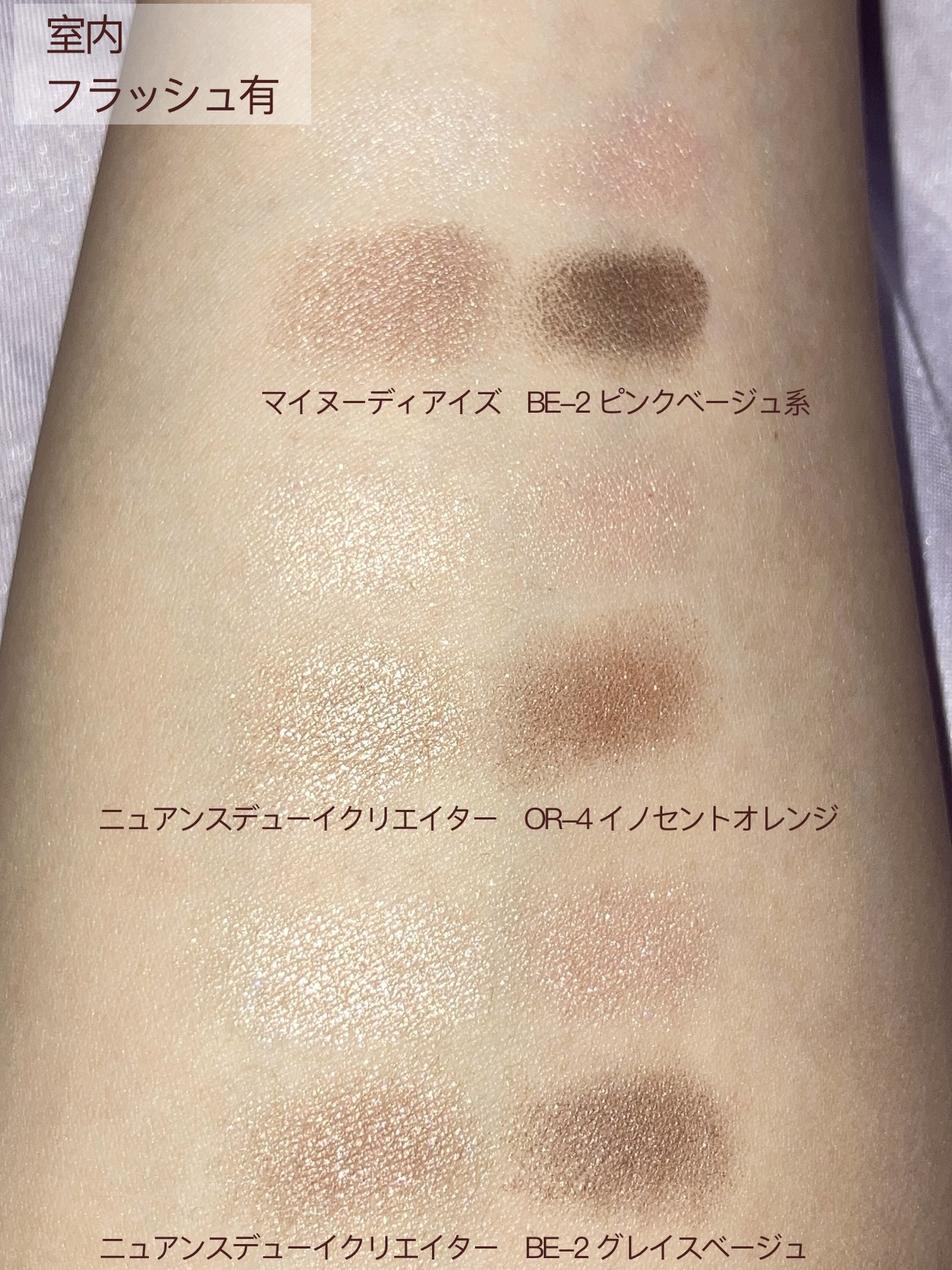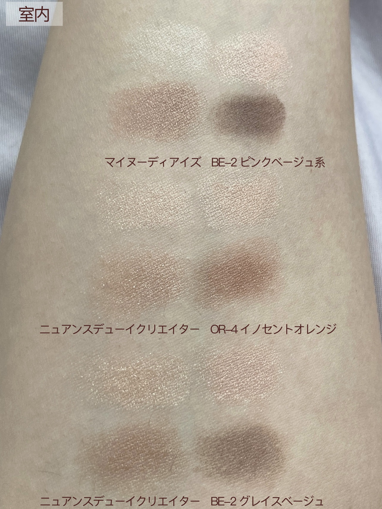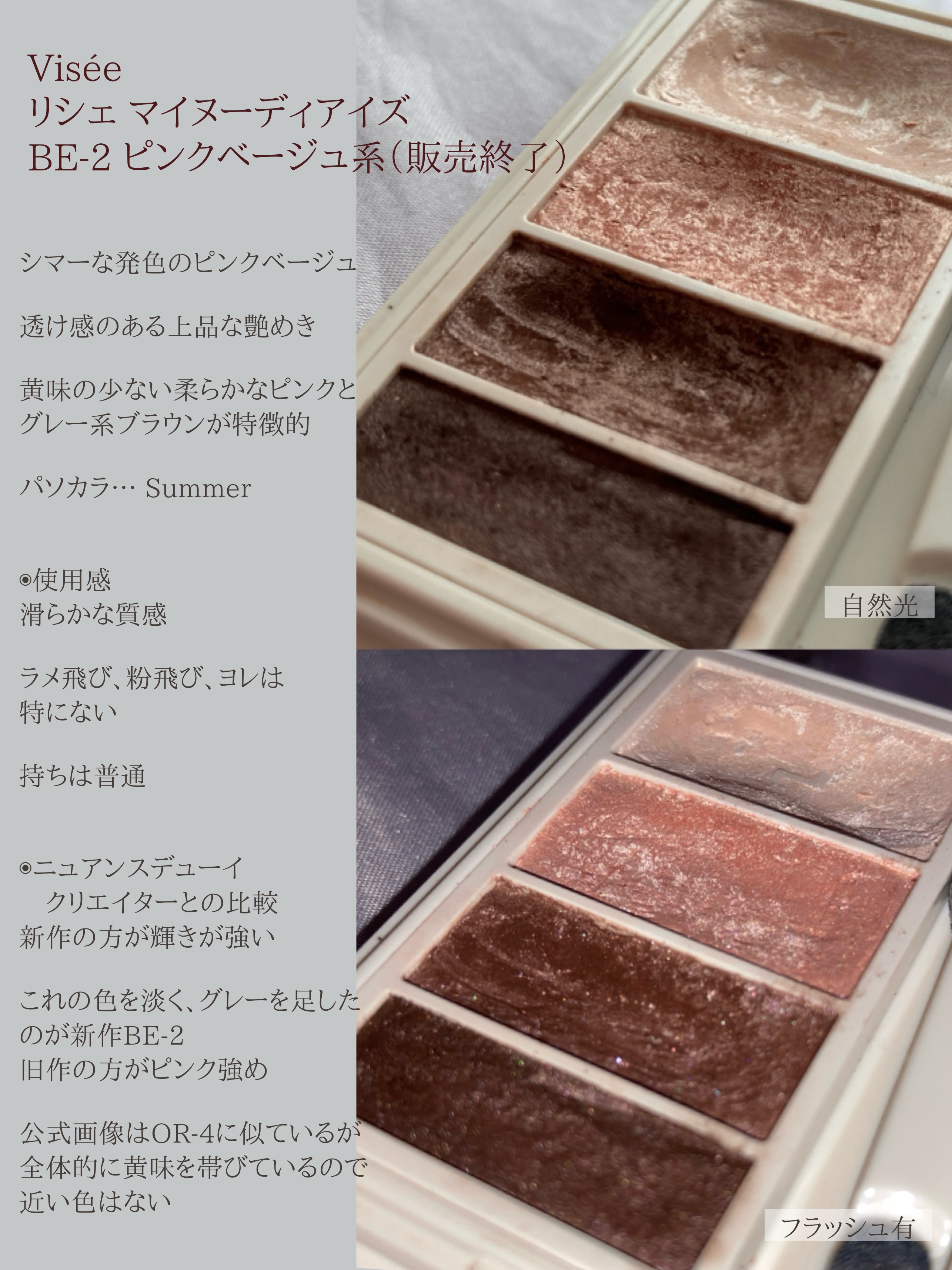 特に上から3番目の色!!! この色が本当ーーーーーに大好きで。 グレー系のピンクブラウンで、私の肌にとてもよく馴染みながらも自然な陰影を出してくれる。 旧作BE-2と新作OR-4の公式画像を見比べて 「「求めていた色とほぼ同じだ!」」狂喜乱舞しました。 こんな綺麗なアイシャドウが1320円で買えてしまう世の中は狂ってる(褒め言葉)なんて言いながら、OR-4だけ買うつもりがBE-2にも惹かれて、2つとも握りしめて飛び跳ねるように帰路につきました。 結果、OR-4よりBE-2の方が求めている色に近かったです。