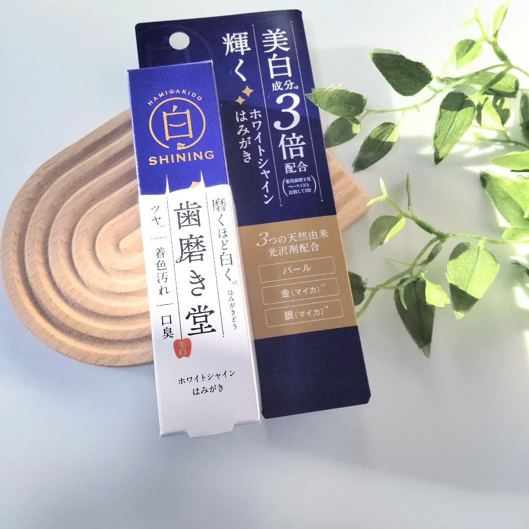 - 磨くほど白く(*1)。3つの天然由来光沢剤を配合、美白成分(*2)を3倍配合したホワイトシャイン ペースト。(薬用歯磨き堂ペーストNと比較して)ツヤ(*3)・着色汚れ・口臭ケアに。 ●天然由来光沢剤:パール・金(マイカ)(*4)・銀(マイカ)(*4) ●効果・効能:歯を白くする/歯のやにをとる/口臭を防ぐ/むし歯を防ぐ/歯石の沈着を防ぐ/歯垢を除去する/口中を浄化する ●週1回の集中ケアとして「歯磨き堂 電動ホワイトニングクリーナー」(別売)との併用もおすすめです *1 ブラッシングにより本来の歯の白さに近づけること *2 清掃助剤:リン酸3Ca、ヒドロキシアパタイト、ケイ酸Ca *3 光沢剤による *4 金:酸化チタン・マイカ・酸化鉄、銀:酸化チタン・マイカ