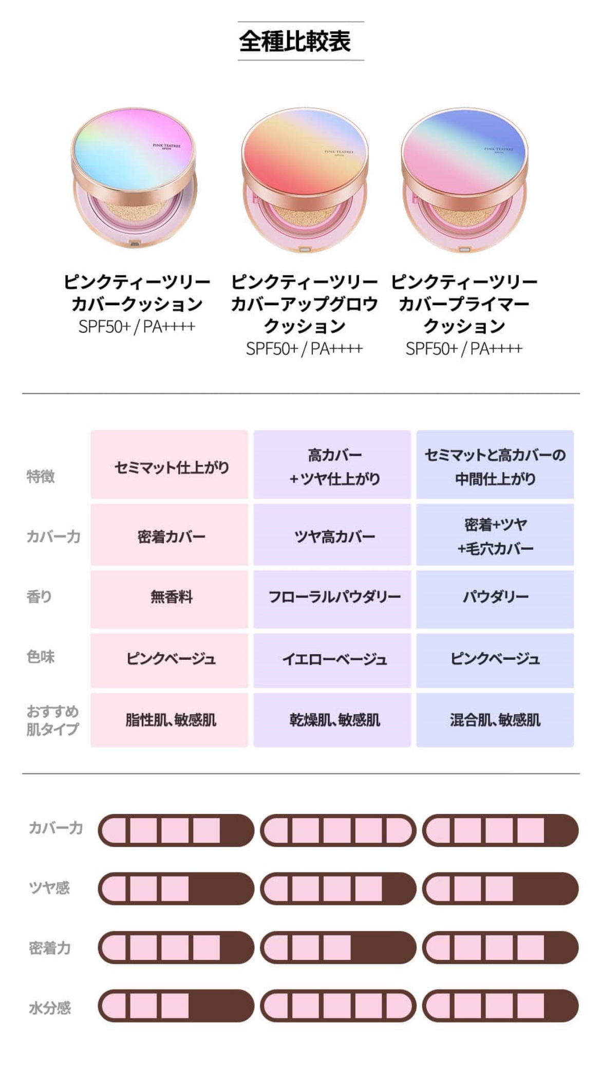 混合肌や敏感肌におすすめのピンクティーツリーカバープライマークッション カラーは『21号』を使用しました! SPF50+ PA++++の高UVカットのクッションファンデーション うるおい感がありながら、ピタッと肌に密着してくれるテクスチャ