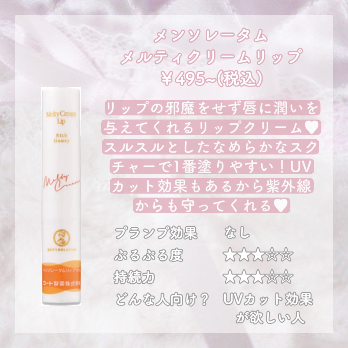 | リップクリーム・リップケアランキング第35位 | 全く乾燥しません!保湿力高いのにベタつきが気にならないところがお気に入りのポイント♡ | 詳細を見る | |