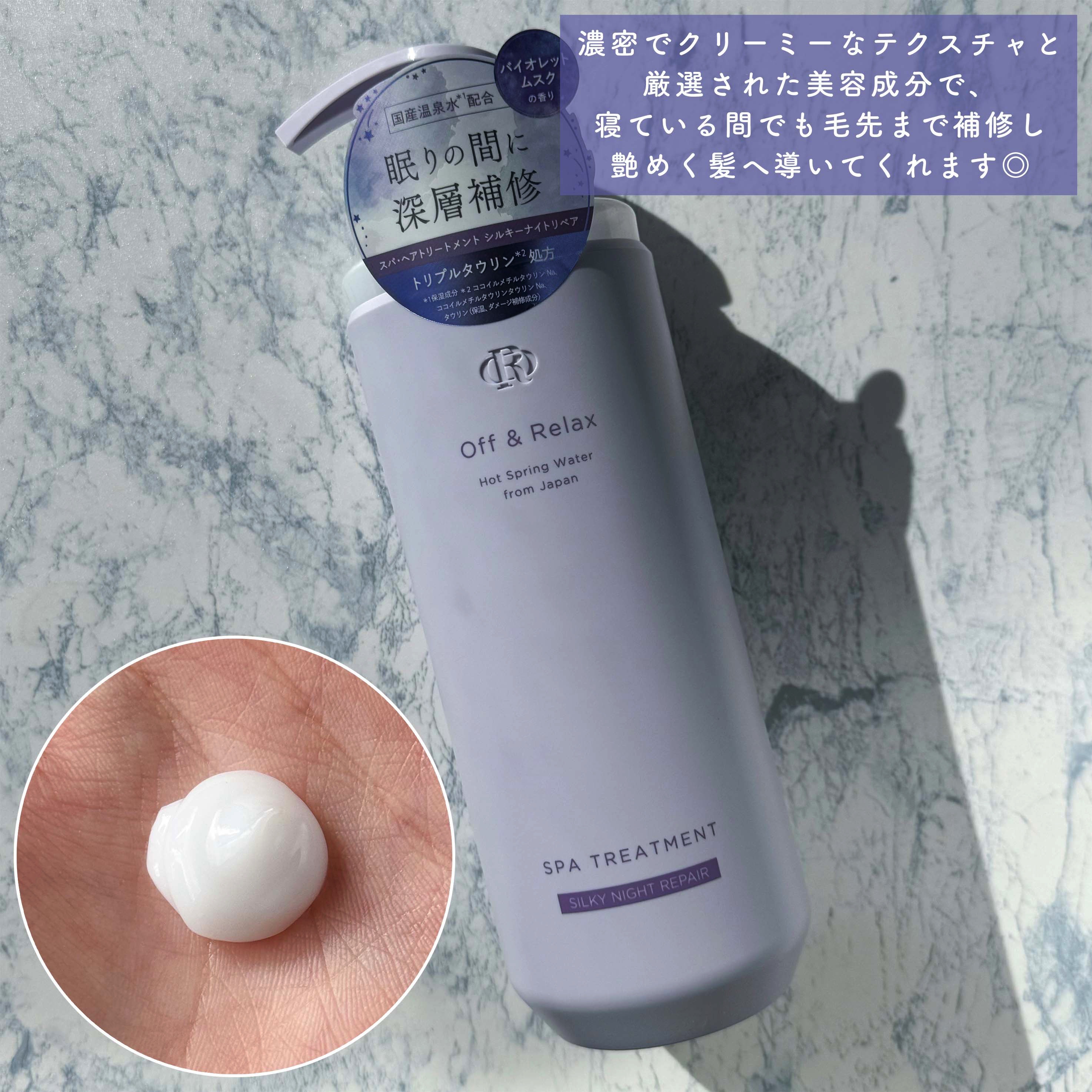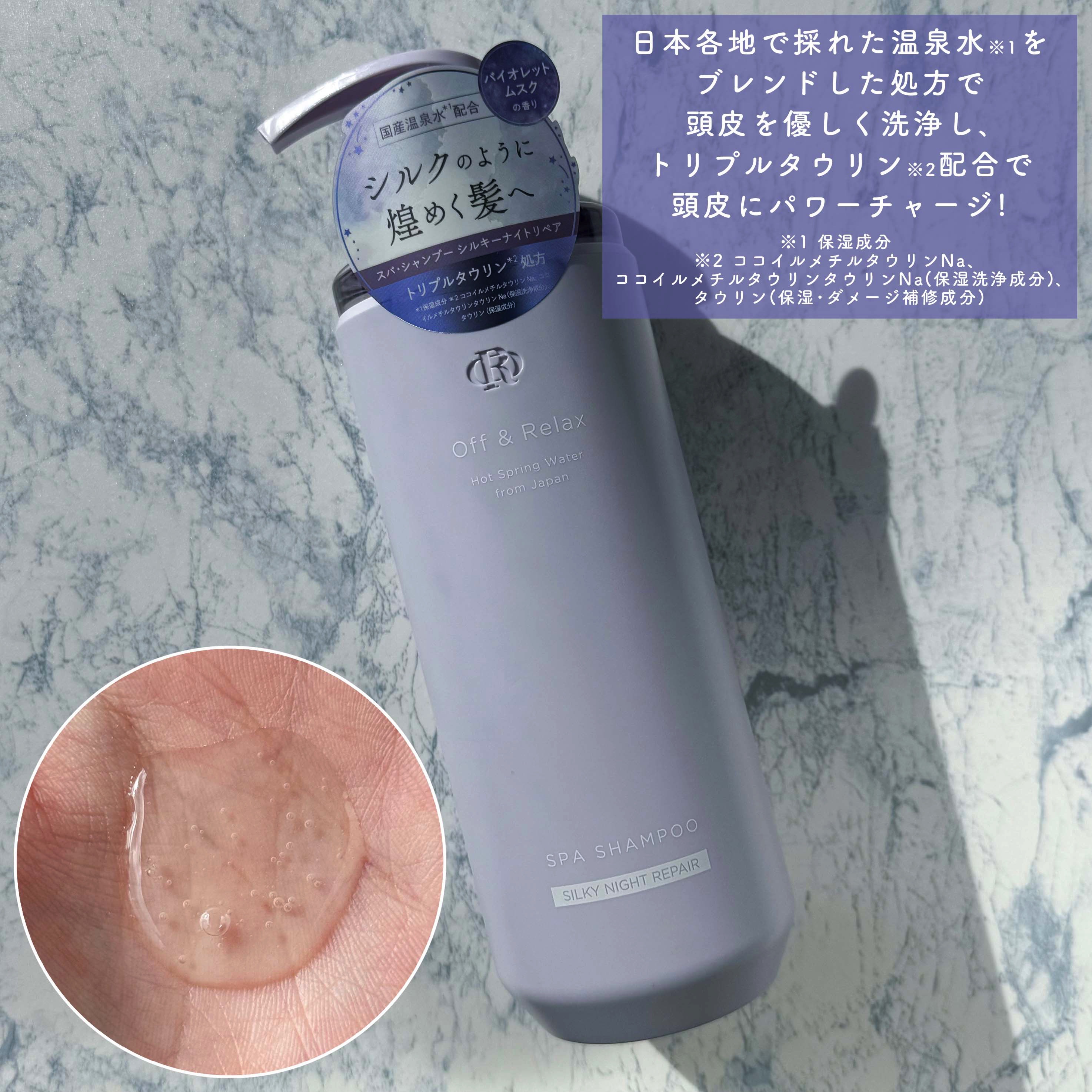 - Off&Relaxシルキーナイトリペアは髪のダメージ補修に特化したシリーズ。出雲・湯原・アルプスの3種の国産温泉水が頭皮と髪の汚れを優しく落とし、特別に配合されたトリプルタウリン※1が髪にハリ・コシを与えます。紫外線やパーマ、ヘアカラーからの髪ダメージを予防するヒートプロテクトテクノロジー※2を採用し、さらに五大保湿成分※3を配合して髪を芯から補修。キューティクルの整ったサロン帰りのような髪へ。オリジナルに調香したバイオレットムスクの香りは、まるで雨上がりの夜の花屋敷から漂う、咲き誇る花々の初々しくも、どこか神秘的で蠱惑的な香りがあなたのバスルームを包み込みます。 ※1ココイルメチルタウリンNa、ココイルメチルタウリンタウリンNa、タウリン※2メドウフォーム-δ- ラクトン配合によるダメージ補修のこと※3ユズセラミド、コエンザイムQ10、トレハロース、ヒアルロン酸、大豆タンパク