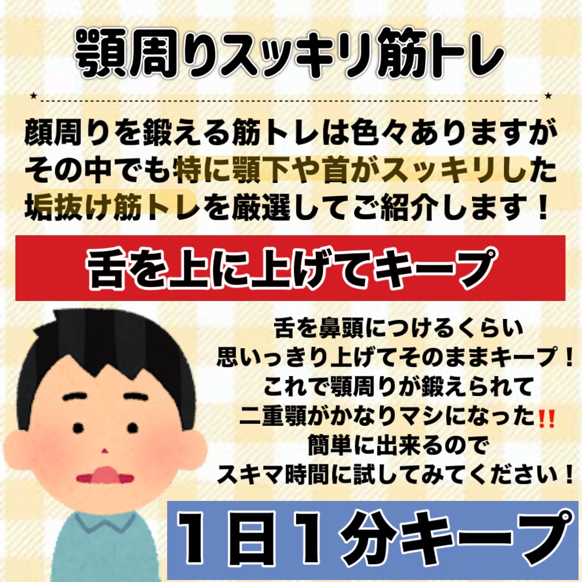 私が全力でオススメしたい、 顎下のお肉を落として、顔をシュッとさせる超簡単な筋トレをご紹介します!!! 用意する物もなく、何かしながらでも出来る筋トレです🙆🏻👌✨ 毎日継続すると、1週間以内に効果が出ると思います!! (見た目に出るのはもう少し時間がかかりますが、触るとスッキリしたのがほんっっに分かる!!!) 筋トレ❶ 筋トレ❷ すっごく効果があるので、皆さんもぜひ試してみてください!!