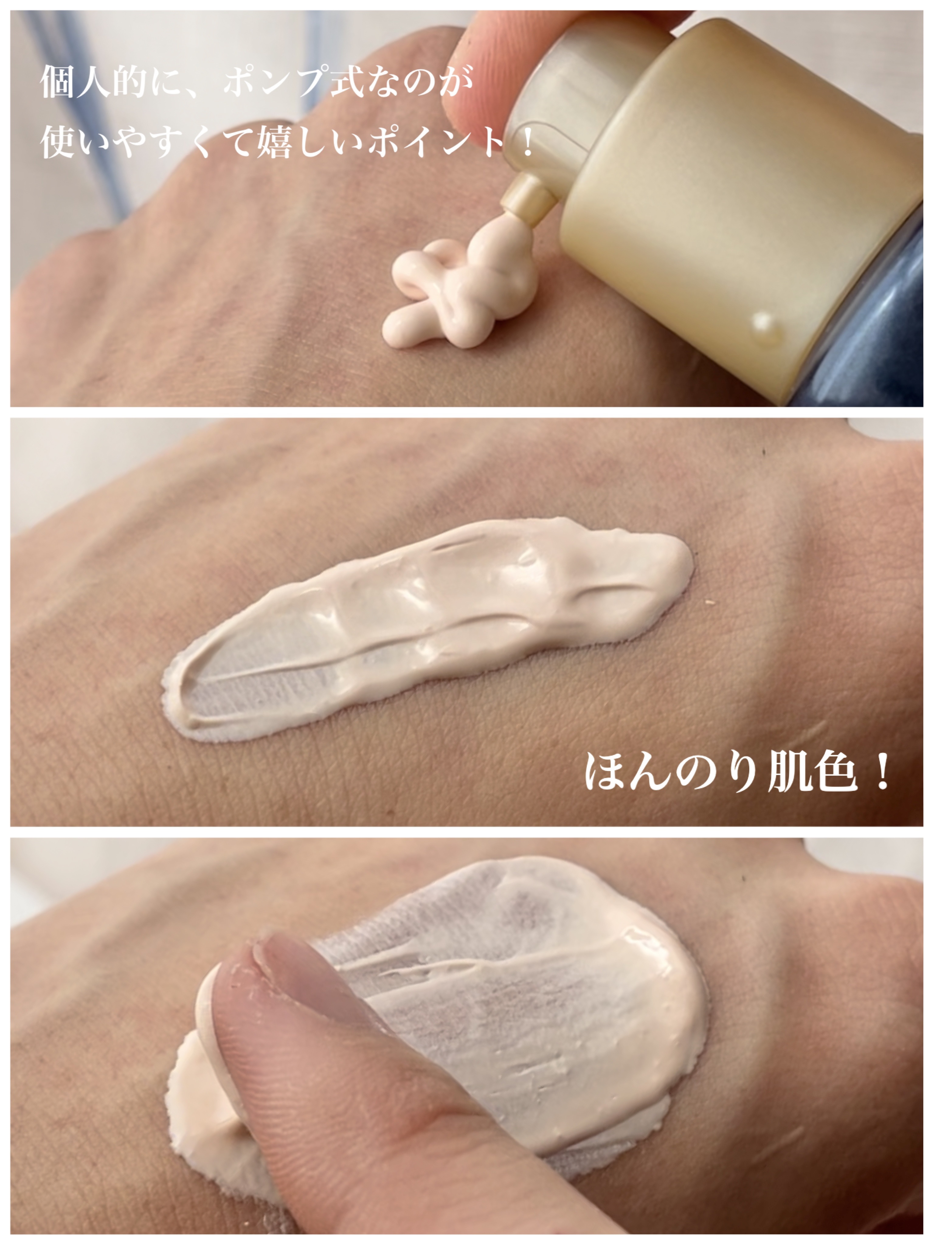 - SPF50+ PA++++ グルタチオン*やナイアシンアミド*が入った、スキンケア効果の高い、化粧下地としても使える日焼け止めです。 さらに、ヒアルロン酸*も入っているので、水分ケアまで可能!冬場でも、長時間乾燥が気になりにくい! スキンケアで肌を潤わしながら、日焼け対策もでき、化粧下地としてベースを整えてくれます。 しっとりとしたテクスチャーですが、仕上がりはベタっとせず、肌の角質層を潤わせるので、メイクの密着力を高め、長時間潤いを感じます。 ほんのりピンクがかった色で、肌に高級感と多幸感を演出してくれます。 *整肌成分